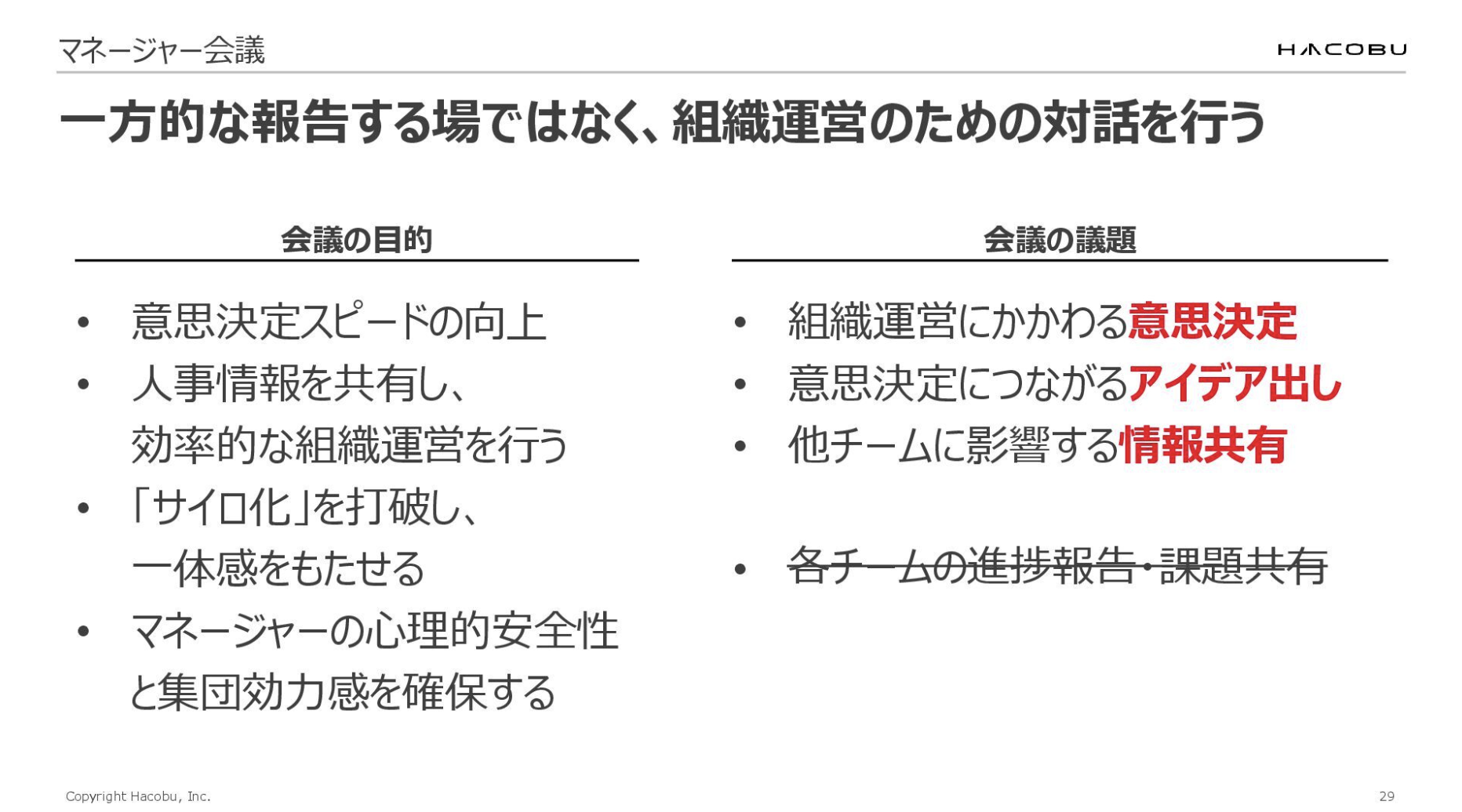 今回登壇するにあたって改めて気づいたのですが、よくある各チームの進捗報告や「うちのチームはこんなことやってます」といったことは一切やっていませんでした。マネージャーが集まって何をしているかというと、組織をどうしていくかというところを議論していたんですね。つまり、一方的に報告する場ではなく、ちゃんと対話する、議論するというところを重視していたりします。