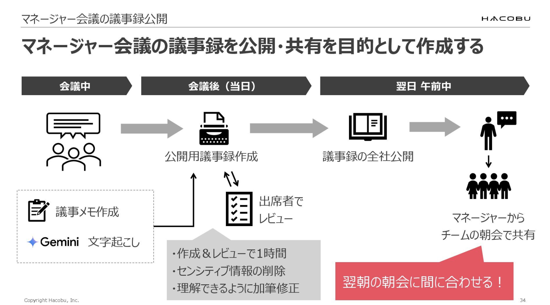 よくある議事メモから、私たちは公開用の議事録というのを作っています。センシティブな情報を取り除いたり、マネージャーの文脈だから分かるような情報を解説したり、過去の議論へのリンクを貼るといった編集作業を毎週1時間くらいかけて行い、会議をした翌日の午前中までに全社に公開することを目標にしています。