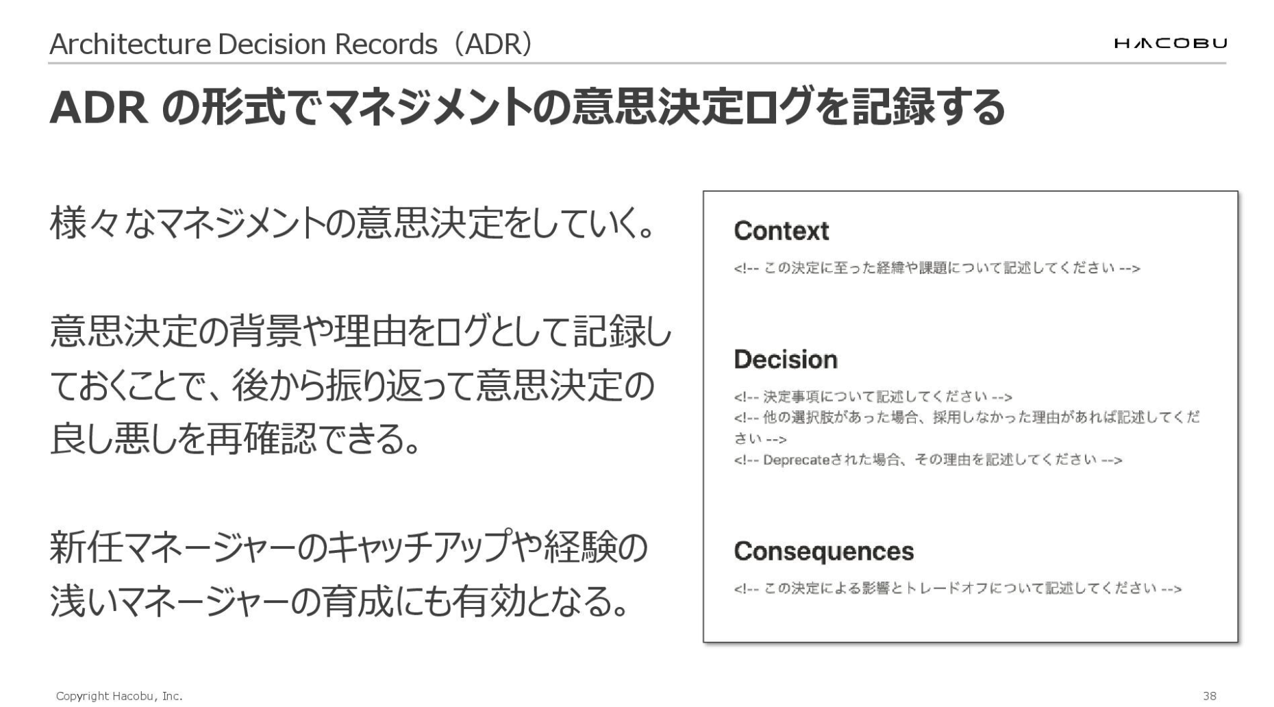 背景のContext、決定したことのDecision、その決定による影響やトレードオフといったConsequencesを記録しています。こういう形式でログを残しておくことで記録もしやすいですし、後々振り返られる、新任のマネージャーが来た時に参考にできるというメリットがあります。