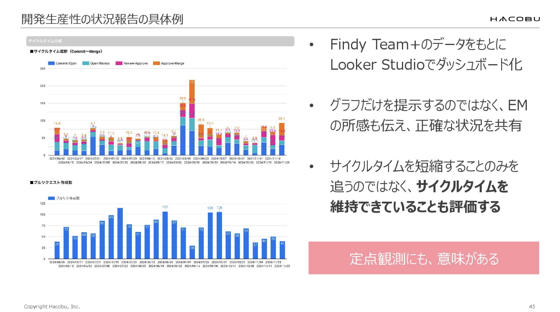 データはFindy Team+から抽出し、Looker Studioでダッシュボード化していますが、グラフを見せるだけではなく、プロダクトチームのEMが解釈と所感を加えています。例えば、プルリク数が減っている箇所があれば、「祝日があって、社内の大きいイベントがあったので稼働が下がりました」といった背景をちゃんと説明します。