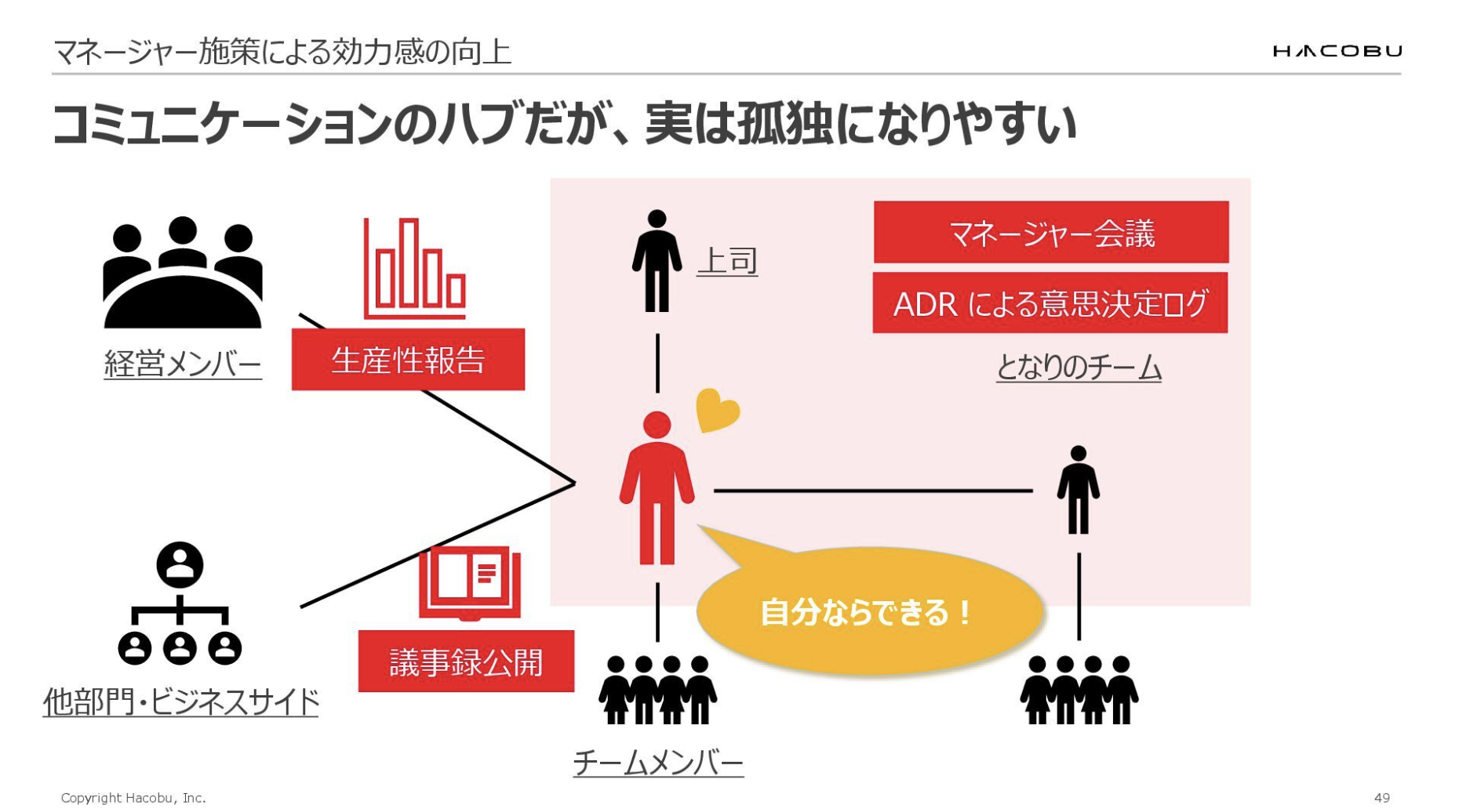 以前は、コミュニケーションのハブでありながら実は孤独になりやすく、悩みは多いが吐き出せない、話してはいるが心を開いて話せないという状況でした。しかし、マネージャー会議やADRによる意思決定ログ、生産性報告、議事録公開といった各施策により、マネージャーを囲む環境づくりができました。