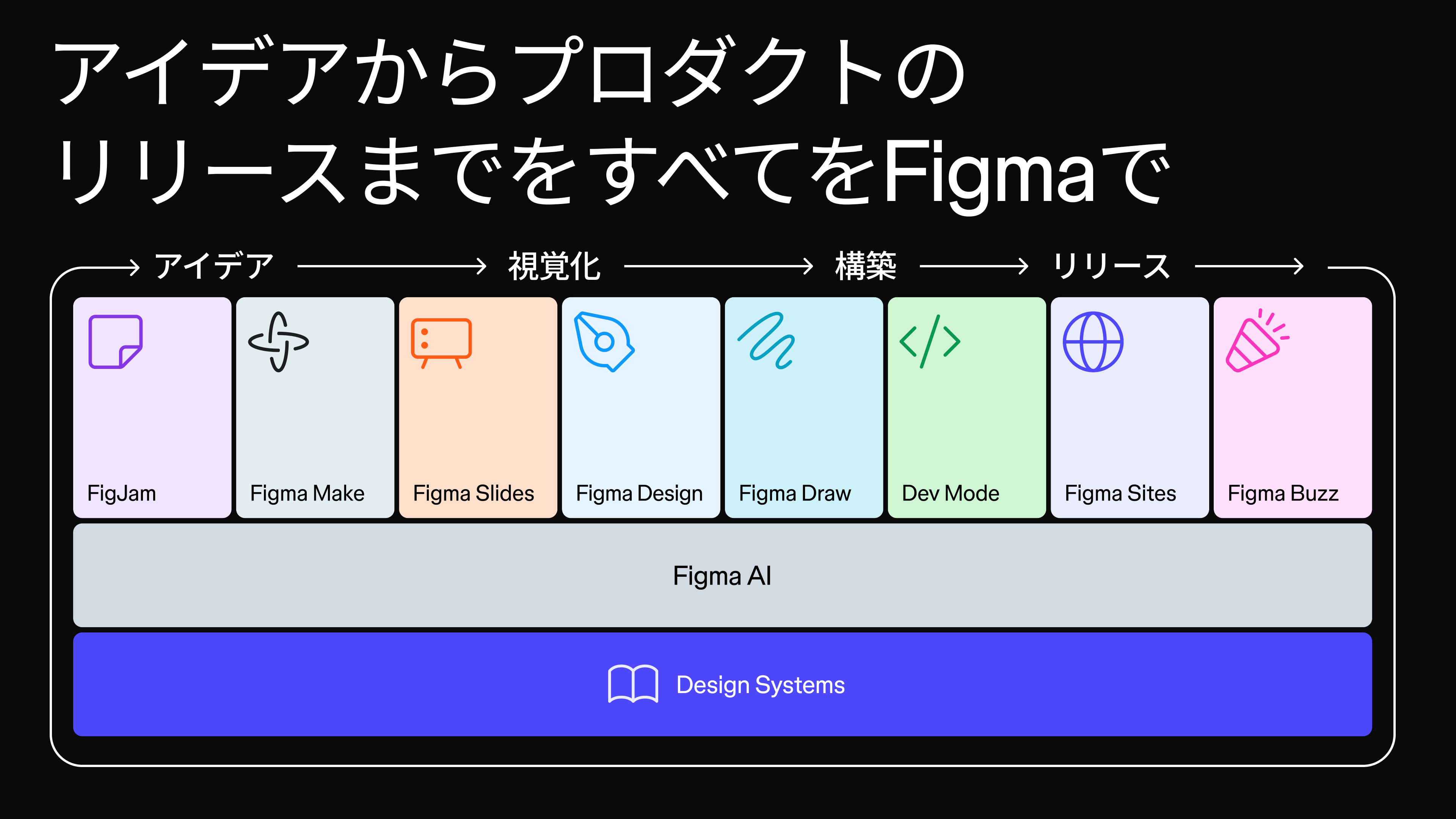 Figmaは視覚化やUIデザインの作り込みだけでは足りないことは私たちもわかっていましたので、どんどん製品を拡大してきました。アイデアを生み出すところから構築・リリースまでをカバーするプラットフォームへと進化しています。その基盤にはAIやデザインシステムがあります。