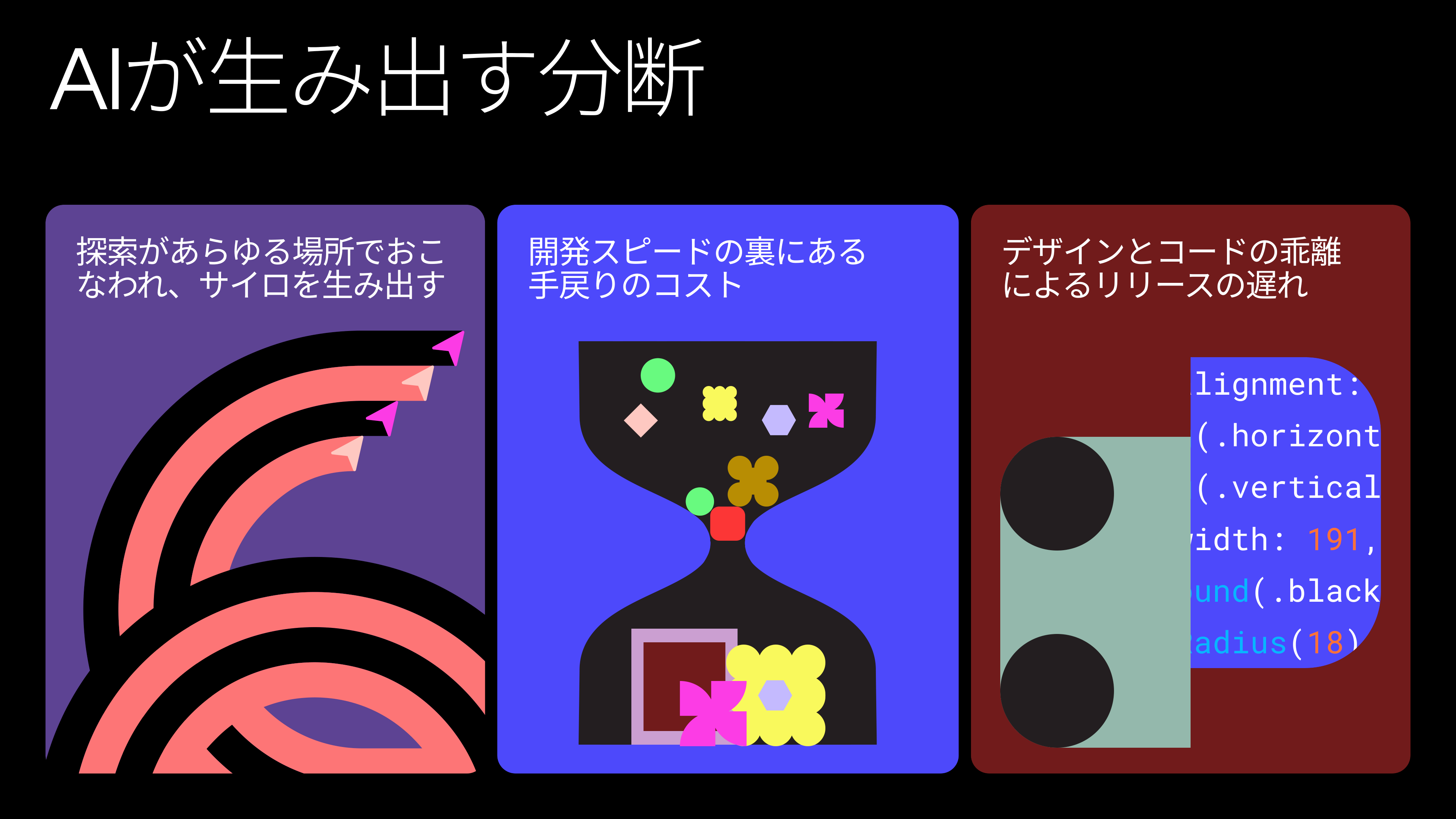 少し掘り下げると、プロダクトマネージャーはテキストのプロンプトでフローや要件定義を進め、デザイナーはFigmaで絵作りをしながらアイデアを考え、エンジニアはコードで直接プロトタイピングをする。それぞれの職種がそれぞれのツールでアイデアを出しますが、デザインシステムのような共通言語に紐付いていないと、結局手戻りが起こりうる。分断が実は進んでいるのではないかということです。