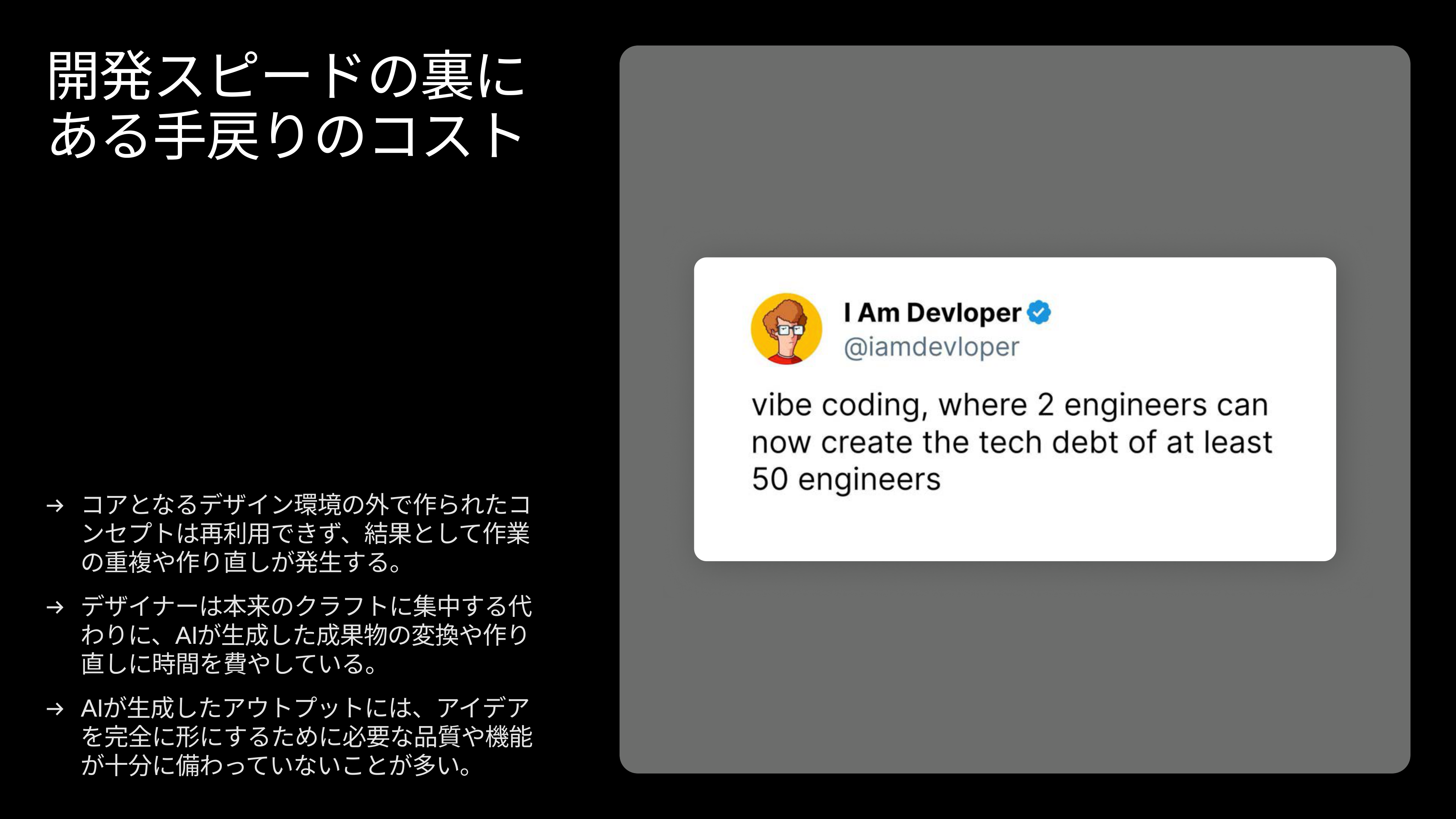 問いとしては「どうやって作るか」以上に「どうやって正しいものを作るか」というフェーズに入っています。これは昔から言われていることではありますが、開発速度がこれほど速くなった今ではより一層重要になっています。