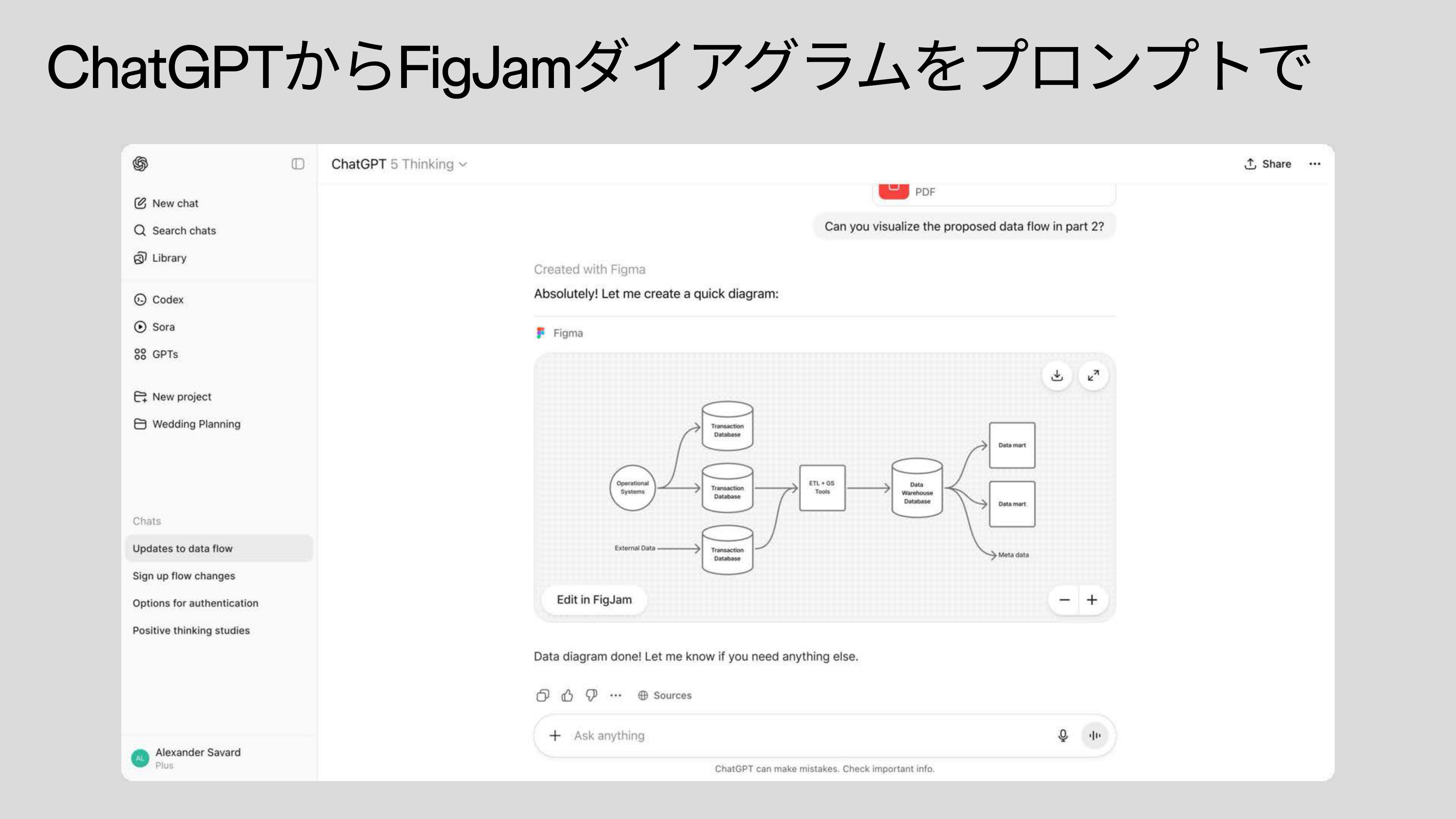 最近ではChatGPTやAnthropicのClaudeとの連携も進んでいます。ChatGPTでテキストのアイデアを壁打ちする中で、ユーザー登録のワークフローや認証プロセスを可視化したいと指示すると、FigJamで編集可能なダイアグラムを作ってくれます。