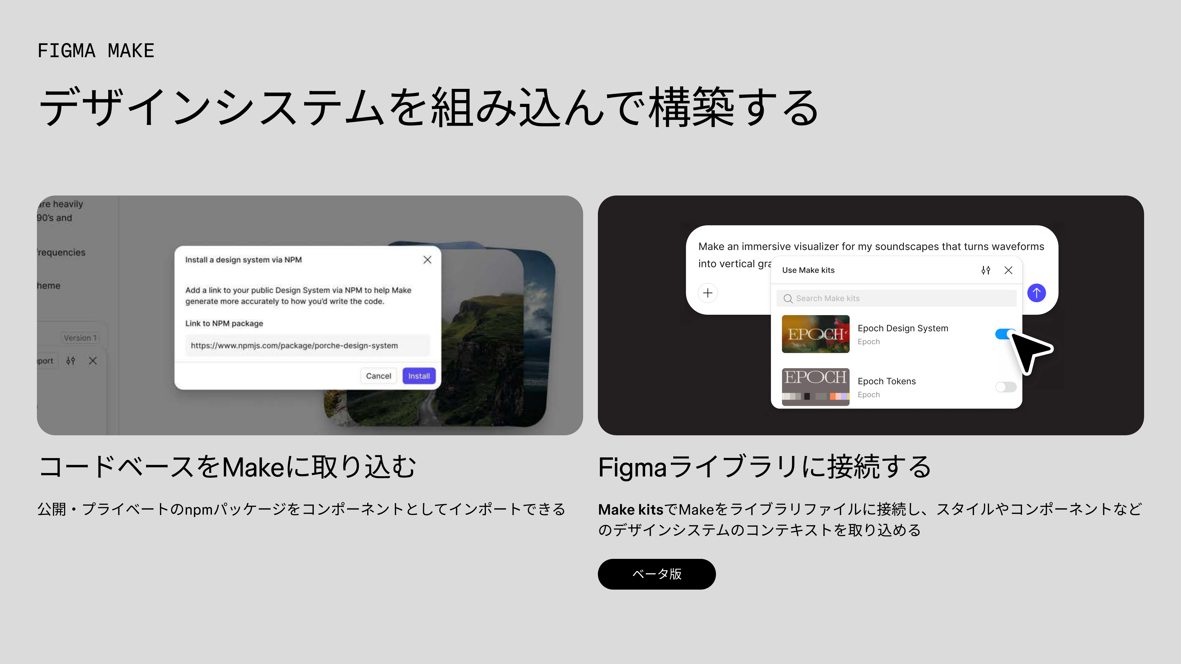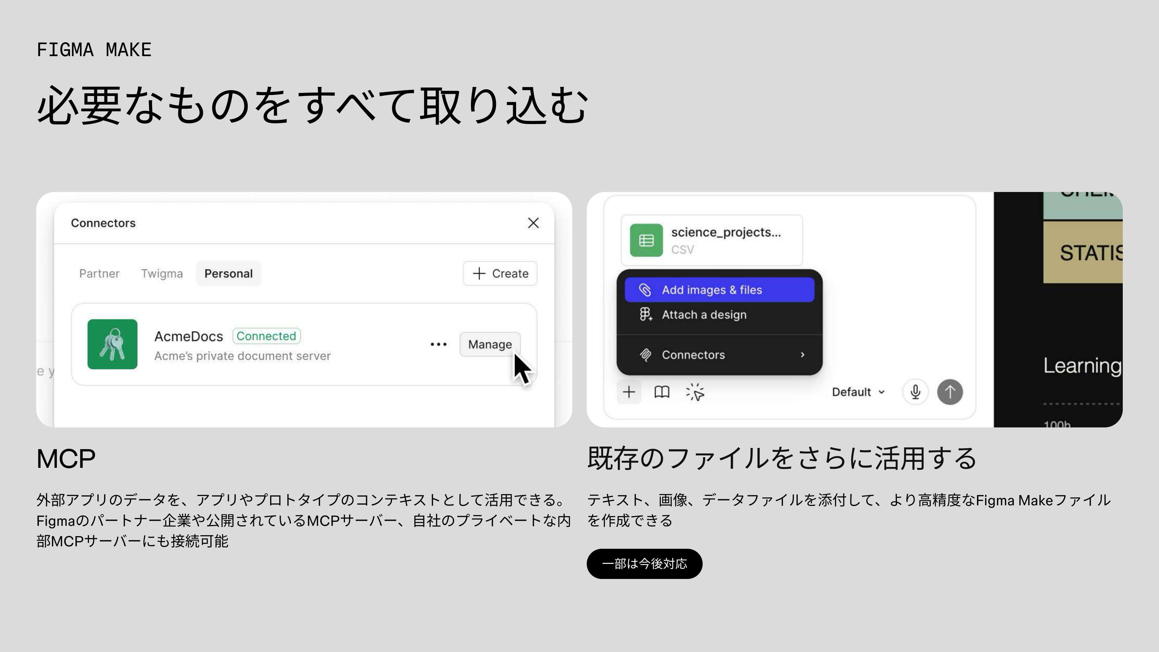 コードベースのものでなくても、FigmaのライブラリのコンポーネントをMakeに取り込むことも将来的には可能になります。現時点ではクローズドベータ版として提供しています。