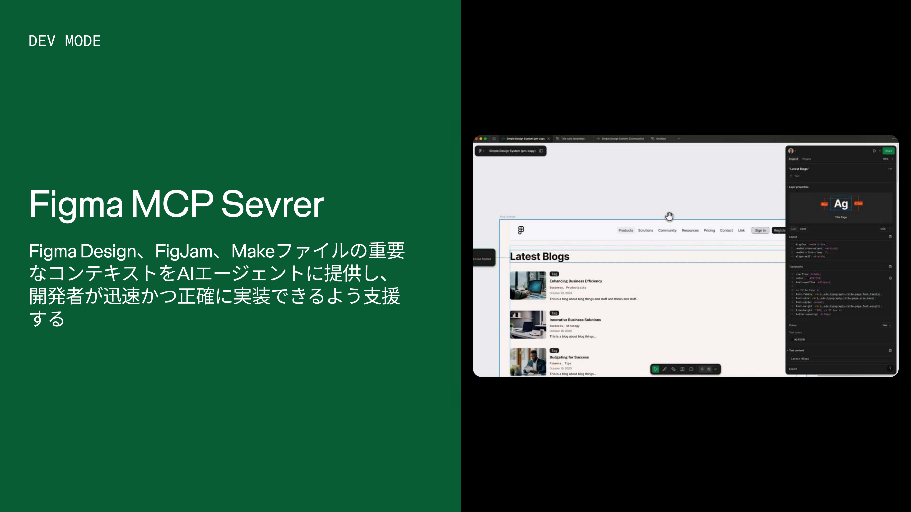 最後の4つ目は、デザインからコードへスムーズに移行できるか、それをリリース予測可能なものにしていくかというところです。FigmaはDev Modeという開発者向けのツールを提供してきました。元々は人間のデザイナーが人間のエンジニアにデザインのスペックをスムーズに渡すための機能でしたが、今やAIエージェントが開発の一人一人のステークホルダーとして増えているということで、さまざまな機能を拡張しています。その中で最も重要な機能の一つがFigmaの公式MCPサーバーです。