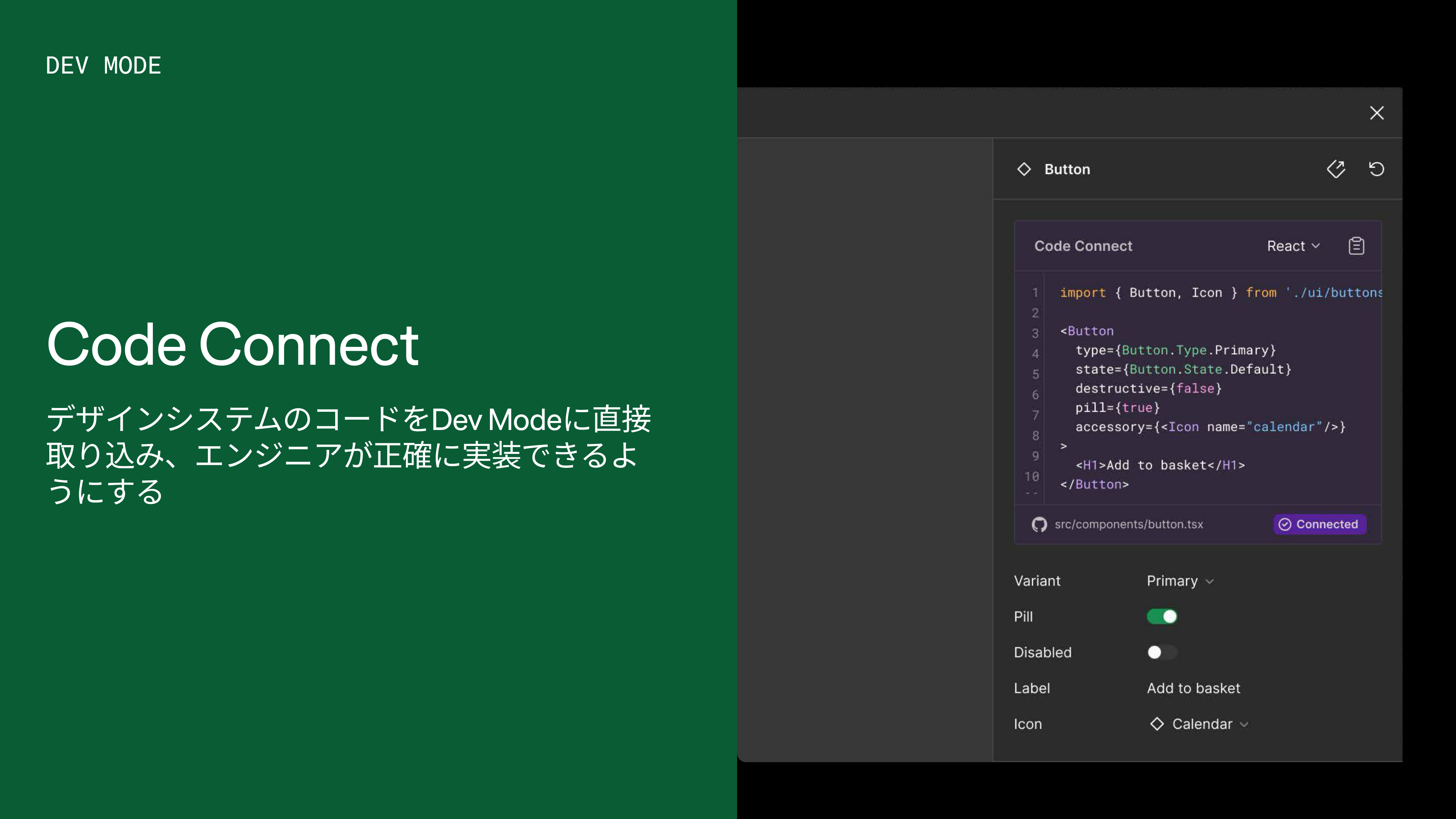 加えてCode Connectという機能があります。Figma上でデザインされたボタンやカードなどのコンポーネントに対応する実際のコードを紐付ける機能です。パッと見ボタンというデザインがあったとき、3人のエンジニアがいたら3人が違うコードを書いてしまうかもしれません。しかしデザインシステムという唯一の情報源となるコード資産と紐付いていれば、どんなエンジニアでもこのボタンを再現するコードはこれだと約束されるので、かなり忠実度が高い形で、より素早くデザインをコード化することが可能になります。これは対人間だけでなく、AIにとってもかなり有効です。Code Connect UIというGUI上でデザインコンポーネントとGitHub上のコードを紐付けることもできます。
