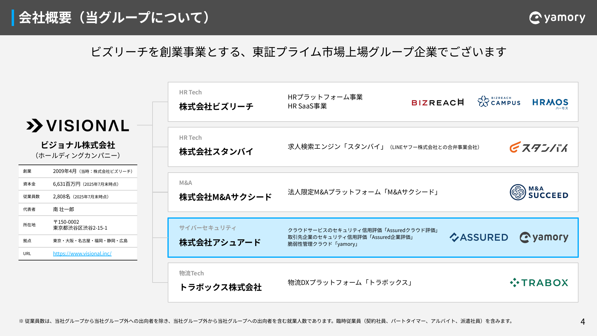 鈴木:株式会社アシュアードは、「ビズリーチ」を創業事業とする東証プライム市場上場のビジョナル株式会社100%出資のグループ会社です。サイバーセキュリティ領域で2つのブランドを展開しており、オンプレミスやパブリッククラウドの構成管理から脆弱性管理を行える「yamory」と、クラウドサービスのセキュリティ信用評価「Assuredクラウド評価」、取引先企業のセキュリティ信用評価「Assured企業評価」を提供しています。