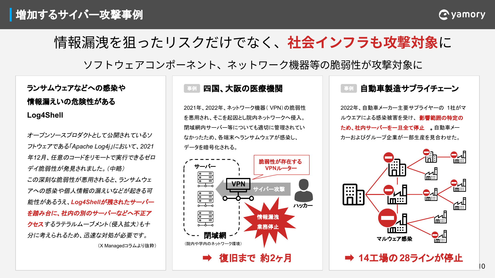 DXの進展に伴いシステムの数は増え続けていますが、その背後で動くさまざまなソフトウェアが攻撃対象になっています。最近の潮流として、単なる情報漏洩だけでなく、社会インフラに関わる攻撃が増えています。Log4Shellの問題、病院のシステム停止、サプライチェーン攻撃による自動車工場14工場28ラインの停止など、日頃からニュースで耳にする機会も増えました。