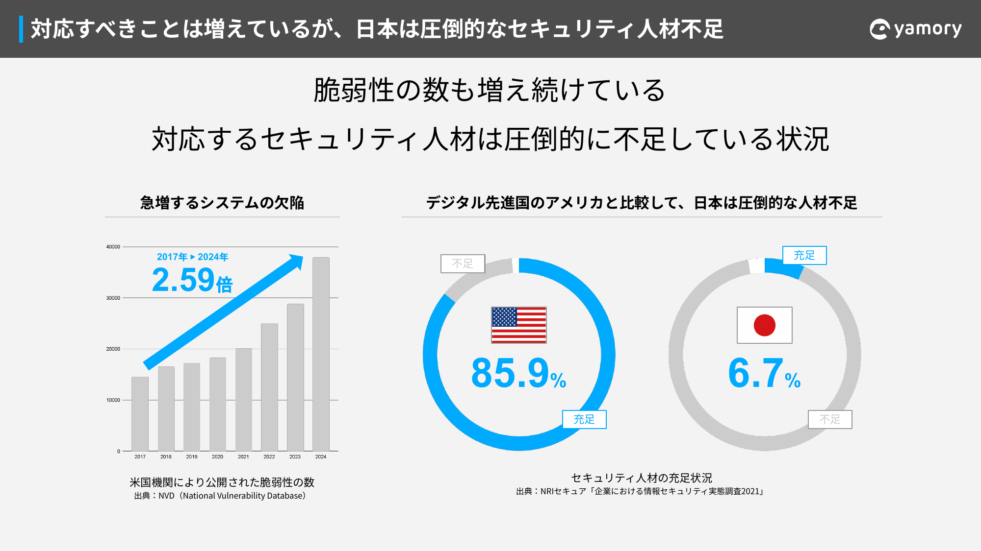 データによると、日本のセキュリティ人材は「充足している」と回答した企業がわずか6.7%です。デジタル先進国のアメリカでは85.9%が充足していると回答しています。なぜこういった差になっているかというと、アメリカではセキュリティ業務の自動化が推進されていて、DXが進んでいる、省力化が進んでいるという背景があります。