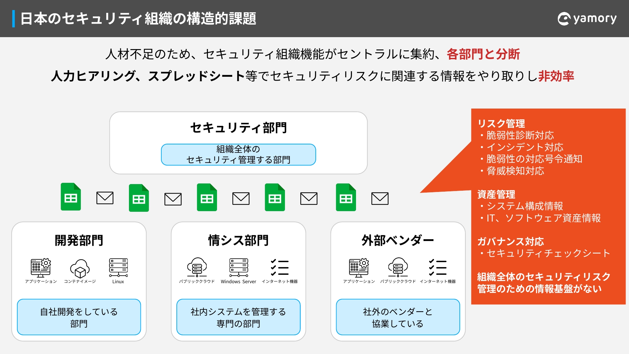 私自身、「ビズリーチ」で開発部長を務めていた時に、製品ラインが5〜6個に増え、部門もいくつもできた中で、組織的にサイバーセキュリティのリスクをどう管理していくべきかという課題を感じたことが「yamory」立ち上げの原体験です。自分自身でこの「yamory」という製品を立ち上げてサービス化したという背景があります。