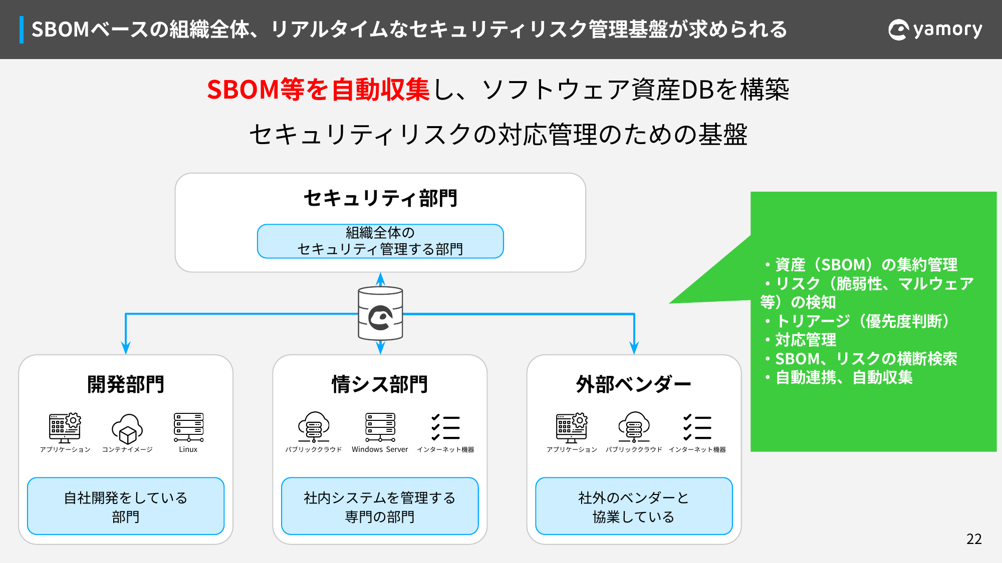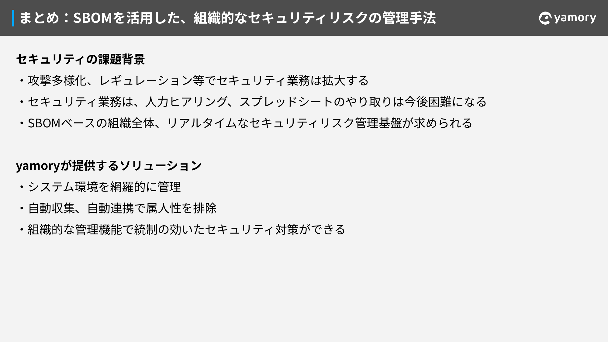 まとめると、攻撃の多様化とレギュレーションの高度化でセキュリティ業務は一定のルールに基づいて行わなければならない時代になっています。SBOMをはじめとするより細かい単位での横断監視ができるセキュリティリスク管理体制が求められています。ソリューションを探す際には、網羅性・自動化・組織管理機能の3つの観点で評価していただくことをお勧めします。