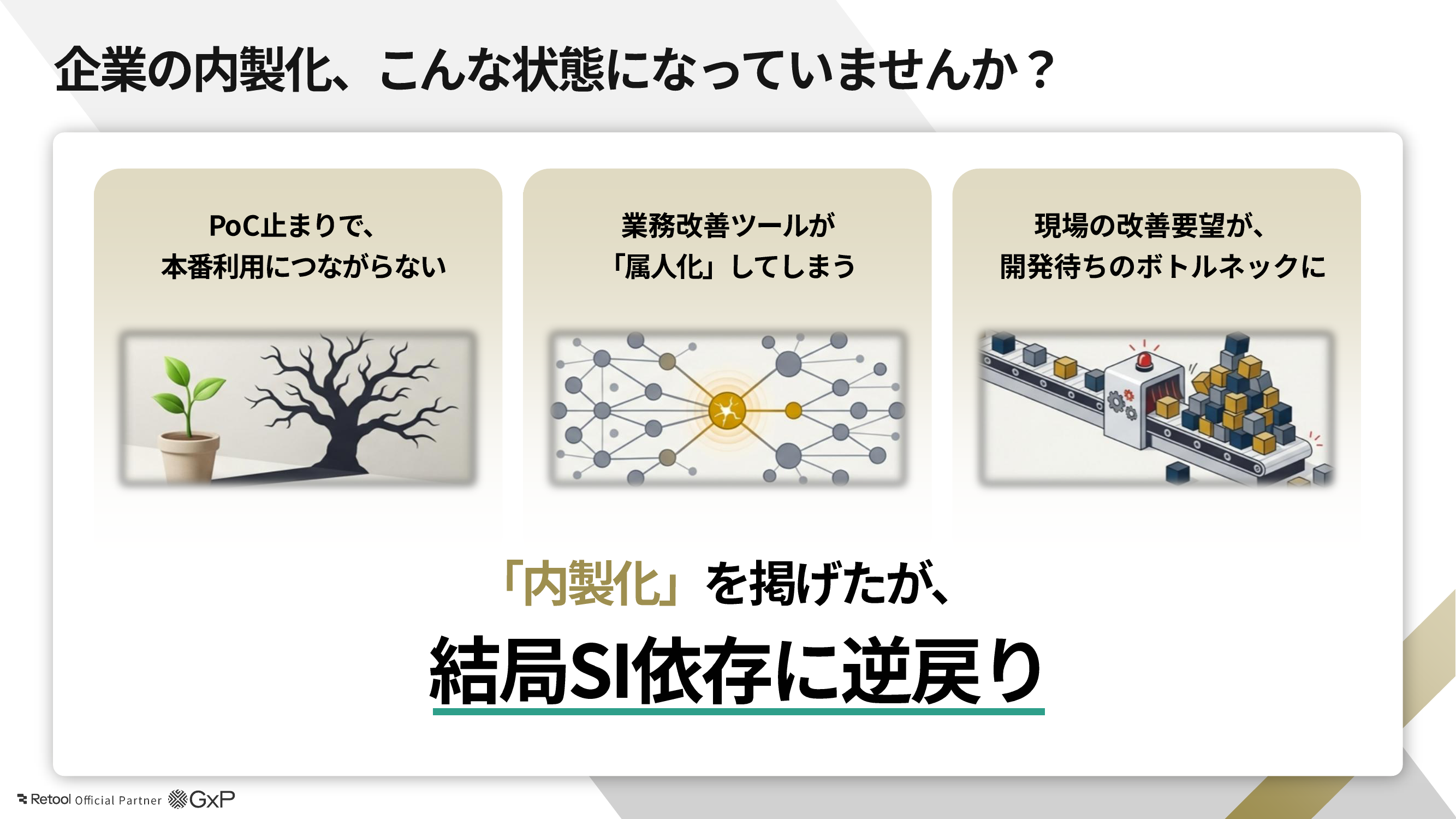 企業の内製化において、こんな状態に陥っていないでしょうか。内製化を始めてみたものの特定のベンダーやSIに依存してしまっている。PoCの域を出ないまま本番利用ができない。改善要望が開発待ちになり、外注した方が確実だと逆戻りしてしまう。Excelやスプレッドシートが乱立し、誰も全体像を把握できない状態になっていないでしょうか。