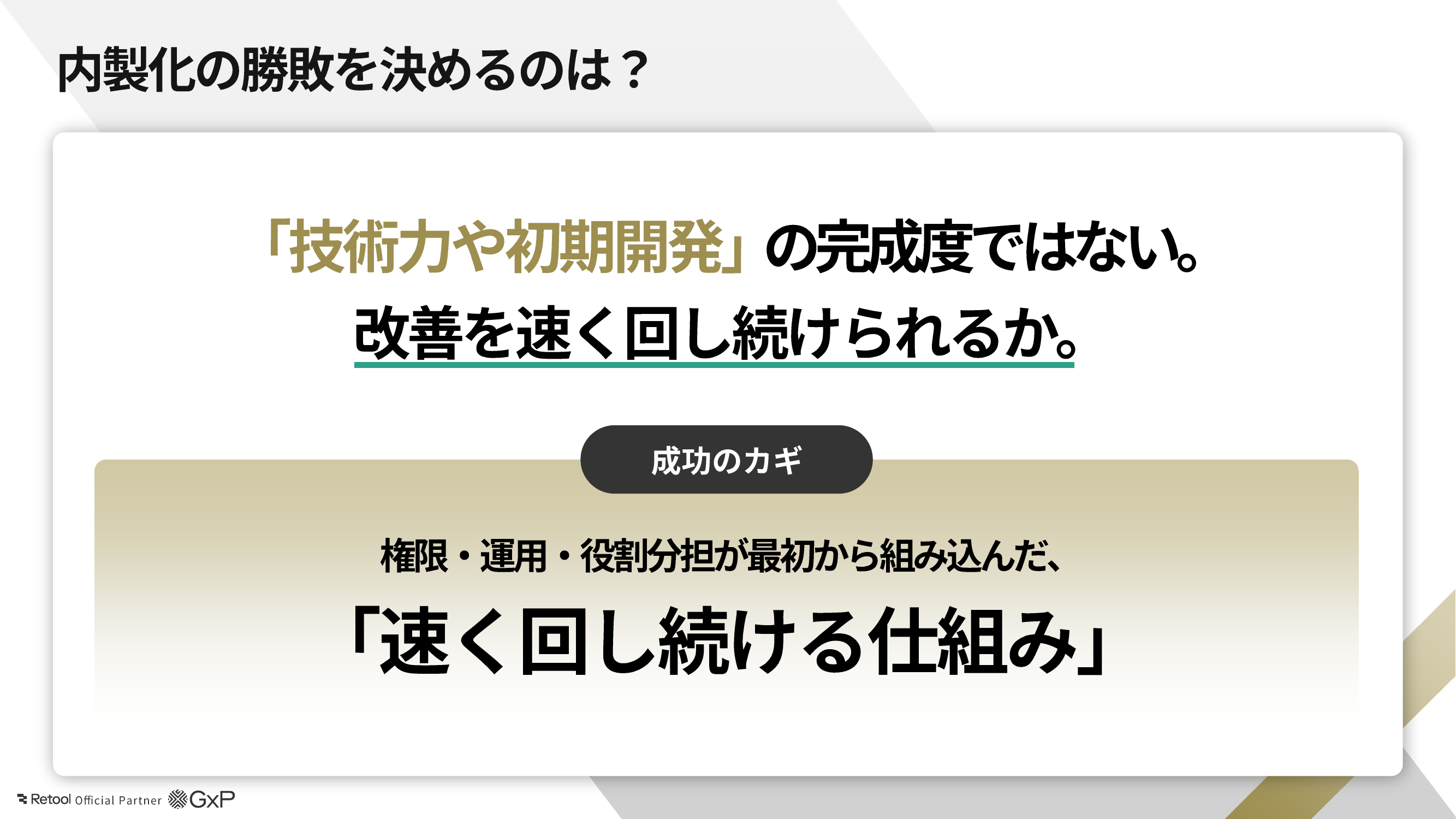 内製化の勝敗を決めるのは初期開発の完成度ではなく、ビジネスの変化に応じて改善を速く回し続けられるかです。自然言語で誰でも業務アプリが作れるバイブコーディングの時代ですが、それを本番で回せるかは別の話です。権限管理や運用、役割分担を最初から仕組みとして組み込み、内製化を「作る」から「回し続ける」へと転換する必要があります。