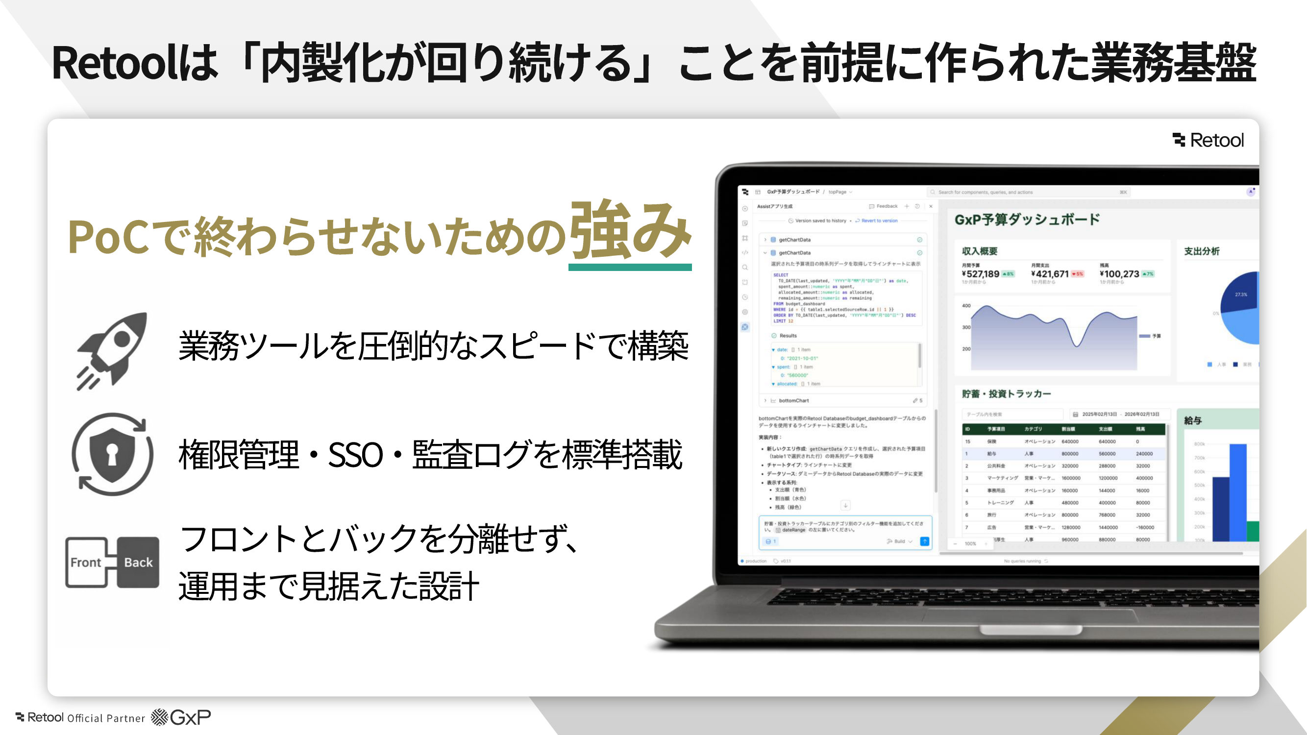 我々GxPは日本唯一のRetoolの公式パートナーとして、2020年から日本国内で内製化を止めずに回し続ける支援を続けてきました。日本の組織特有の意思決定プロセスやガバナンス要件を踏まえた、実効性のある内製化設計をお客様と一緒に考え推進しています。提供しているのはライセンスだけではなく、内製化の設計図そのものです。内製化に必要なのは単に作る技術ではなく、変化に耐え、変化を回し続けられる仕組みです。本日はその具体的なアプローチをぜひ体験してください。それでは井本さん、よろしくお願いします。