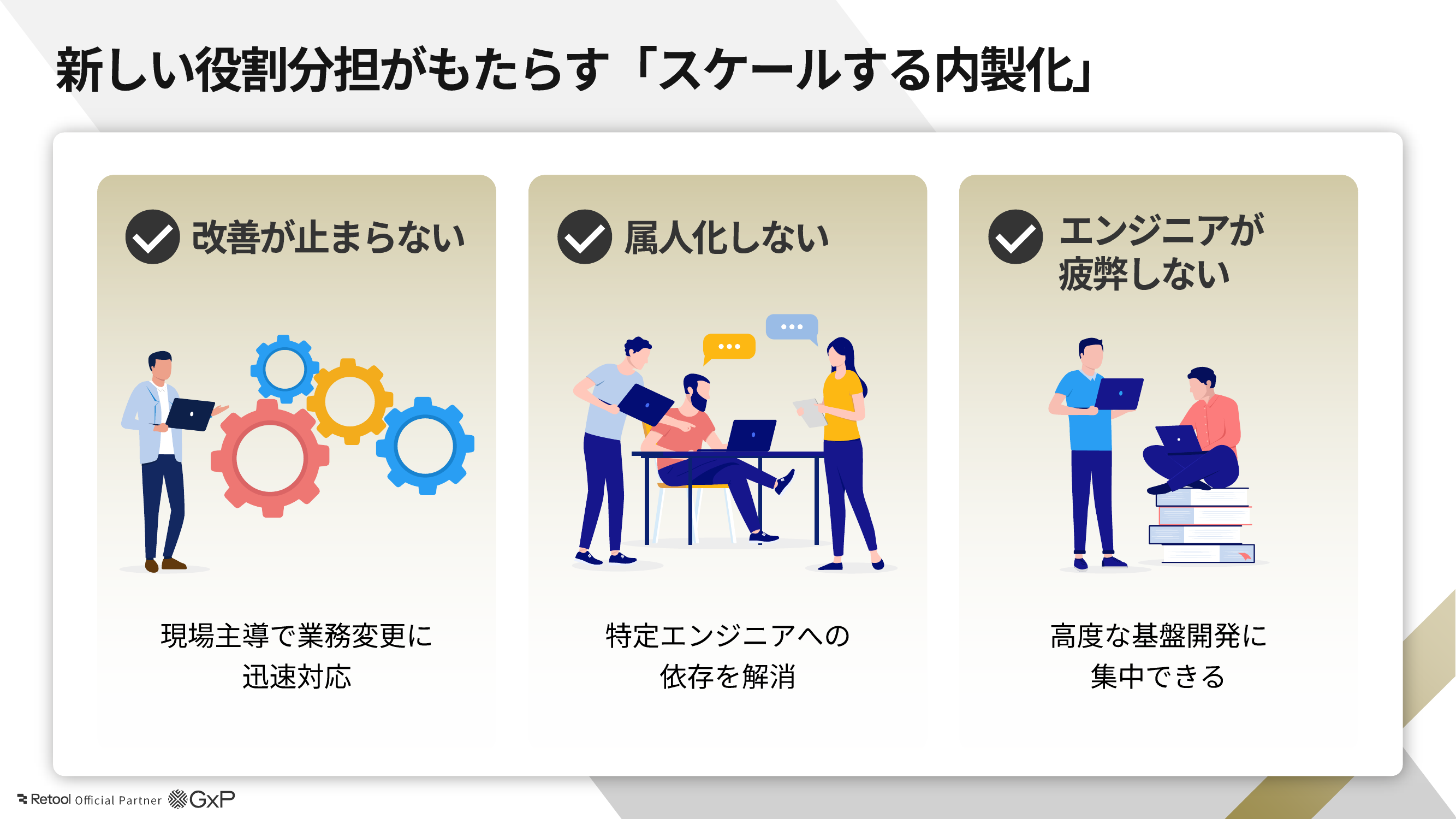 Retoolは企業における役割分担のあり方を大きく変えます。情報システム部門は基盤設計やセキュリティ、ガバナンスといった本来注力すべき領域に集中し、現場の事業部門が自ら画面の改善や業務変更を行いPDCAを主体的に回す。特定の人に依存することなく組織全体で改善が回り、エンジニアはより高度な基盤開発に集中できるようになります。