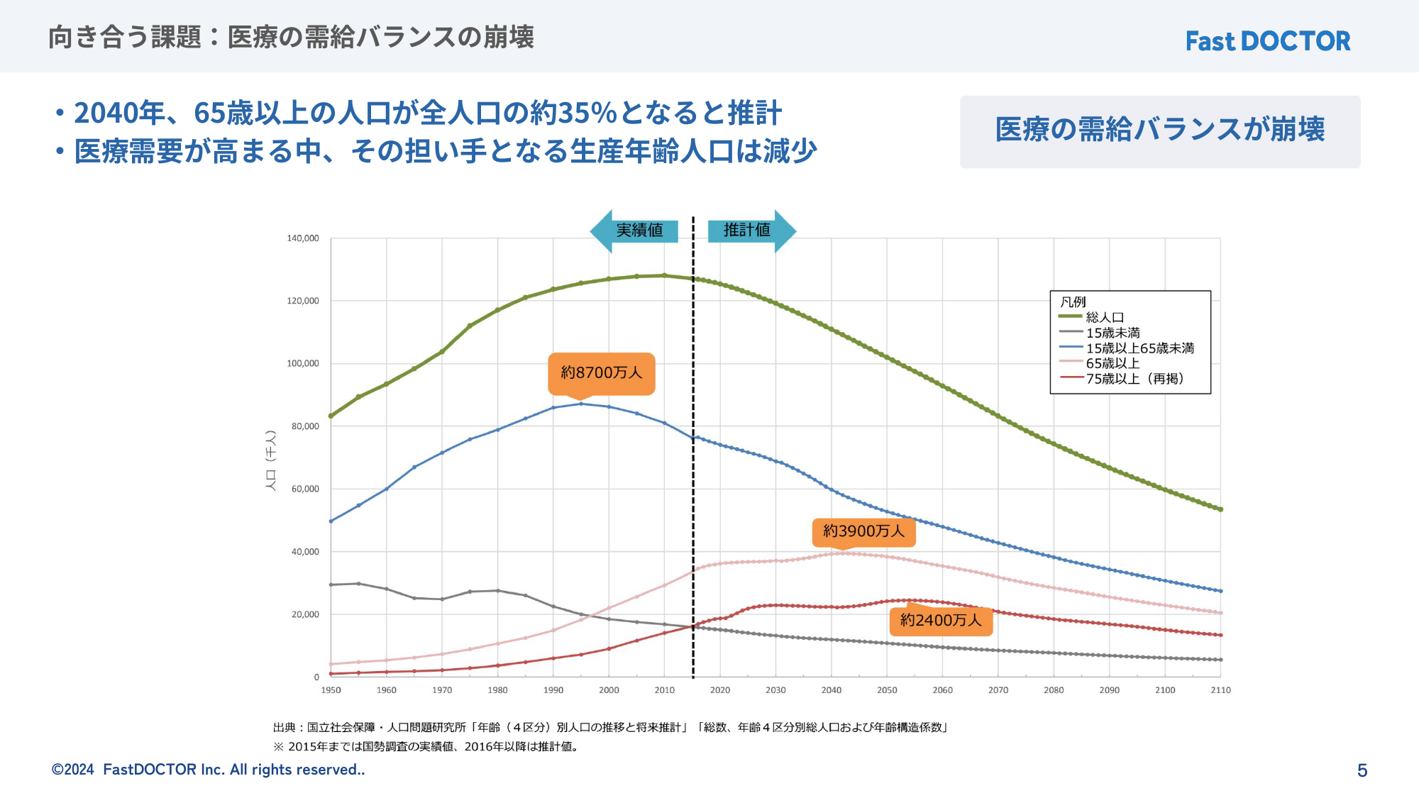 我々が向き合う課題は大きく3つあります。1つ目は医療供給バランスの崩壊です。2040年には日本の全人口の約35%が65歳以上になると推計されており、医療需要が高まる一方で担い手となる生産人口は減少していきます。2つ目は救急車の軽症利用の増加です。救急搬送は年々増加していますが、約半数が救急搬送は不要であったというデータも出ています。