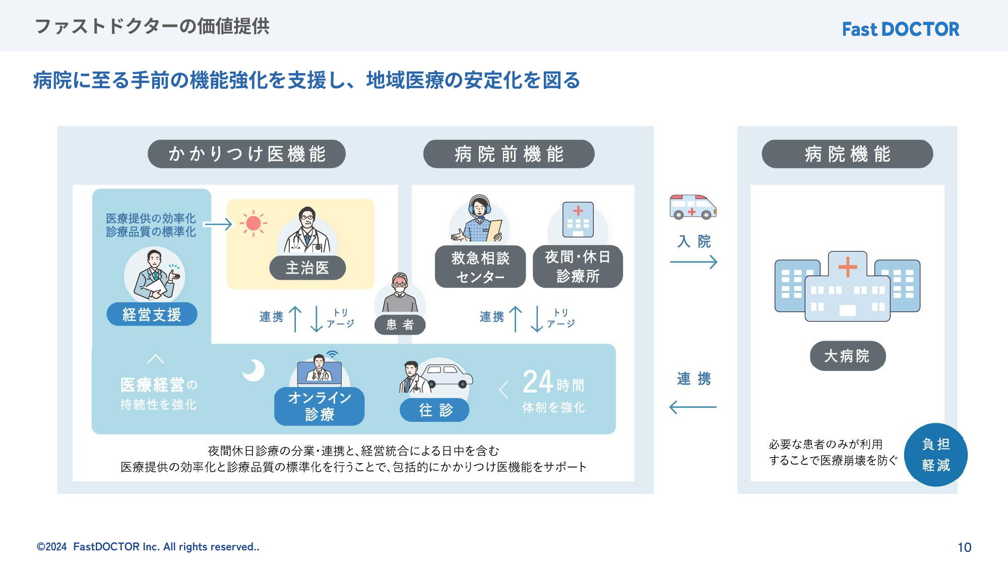 これらの社会課題に対して、私たちは「生活者の不安と医療者の負担をなくす」というミッションを掲げています。祖業である往診事業だけでなく、オンライン診療やかかりつけ機能の強化など、多様なサービス形態でミッション実現に向けた取り組みを拡大しています。病院機能の前段階であるかかりつけ機能や病院前機能を補完・強化する位置づけを担っています。