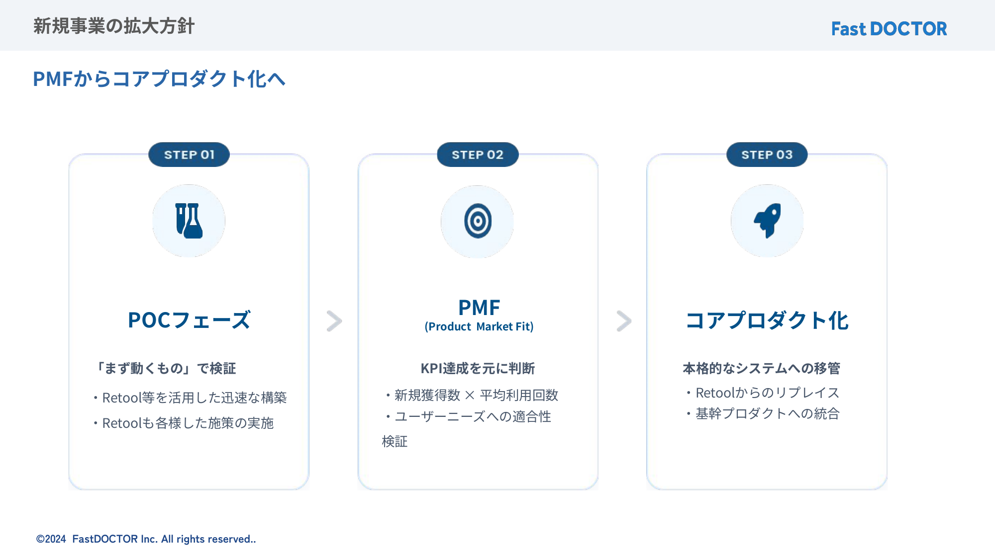 ステップ2がPMFフェーズで、各診療科ごとに設計したKPI──新規獲得数と平均利用回数など──の達成をもとにPMFを判断します。PMF達成に向けてユーザーニーズの適合性検証を数多く実施していきますが、そのサイクルにもRetoolを活用しています。ステップ3がコアプロダクト化のフェーズで、PMFが判定された診療科はローコードツールやスプレッドシート、手運用を交えながら拡大してきたものを、基幹プロダクトへ統合していくフェーズになります。