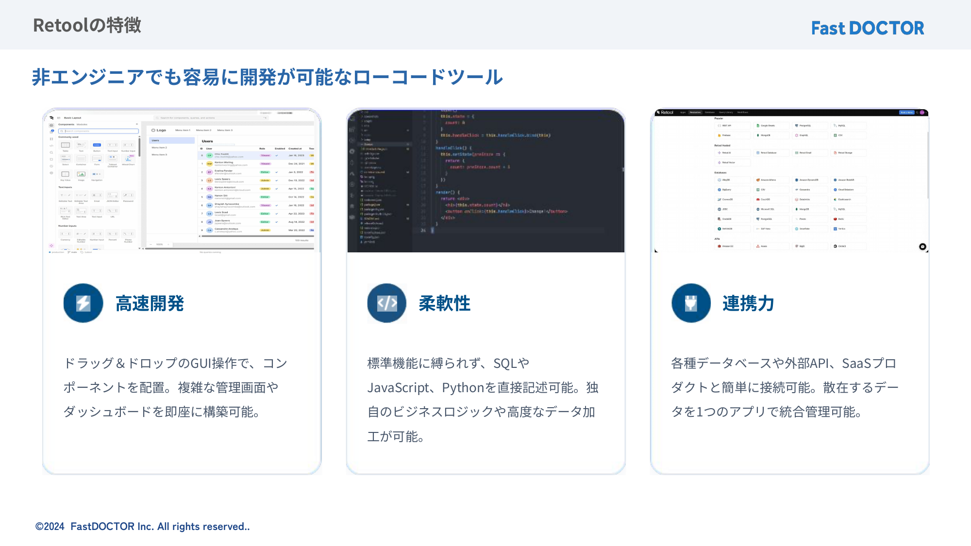 Retoolは2018年のローンチ以来、すでに世界1万社以上が導入しています。重要なのは1万社という数ではなく、PoCで終わらない思想を持つ企業がRetoolを選択しているということです。日本国内でもこの後ご登壇いただくファストドクターさんのように、PoCや初期開発で止まらない「回り続ける内製開発」を実現し始めている企業が出てきています。