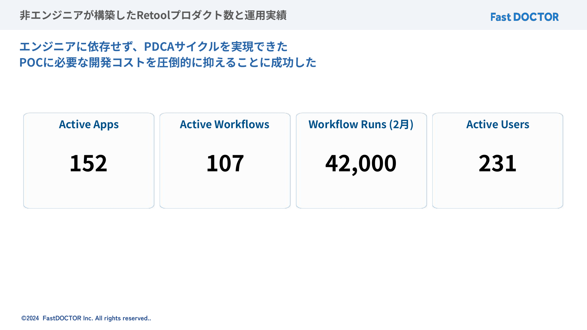 2026年2月現在、Retoolのアプリ数は152、ワークフロー種類数は107、月間のワークフロー実行数は42,000回、アクティブユーザーは231名となっています。大半の社員とアルバイトがRetoolで毎日何らかの業務を行っている状況です。