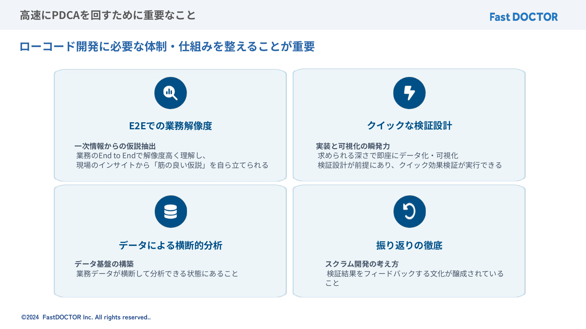 2つ目は検証設計とそのスキルです。PDCAサイクルを高速に回すには、実行後のデータ分析や可視化をクイックにできることが求められます。3つ目はそれを実現するためのデータ基盤です。弊社ではあらゆるデータをBigQueryに集約しているため、探索的なデータ分析が可能になり、精度の高いデータ検証を実現できました。