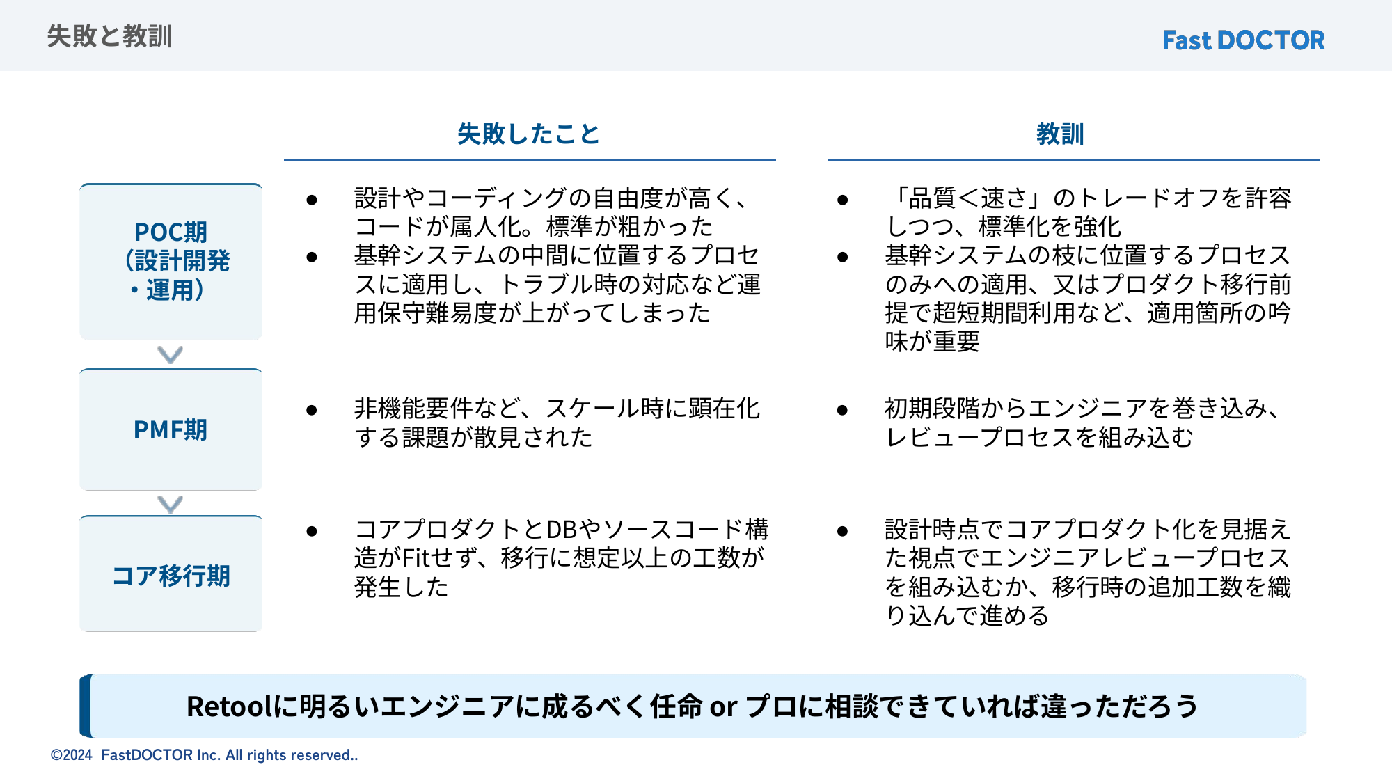 コアプロダクトへの移行期では、Retoolはローコードツールとしての制約や癖があるため、完全スクラッチで開発しているコアプロダクトとデータベース構造やソースコード構造がフィットしない場面があり、移行に想定以上の工数が発生しました。設計時点でコアプロダクト化を見据えたエンジニアレビューを組み込むか、移行時の追加工数を織り込んで進めるコンセンサスがあるとよかったと振り返っています。