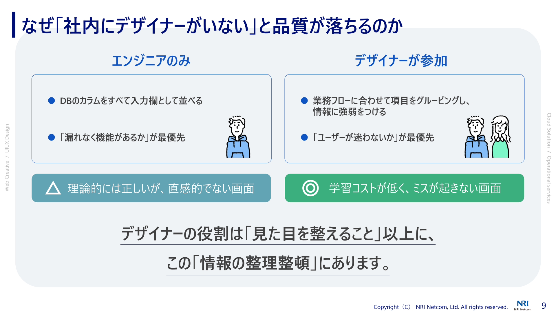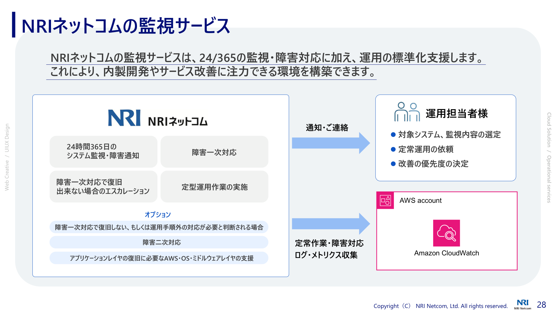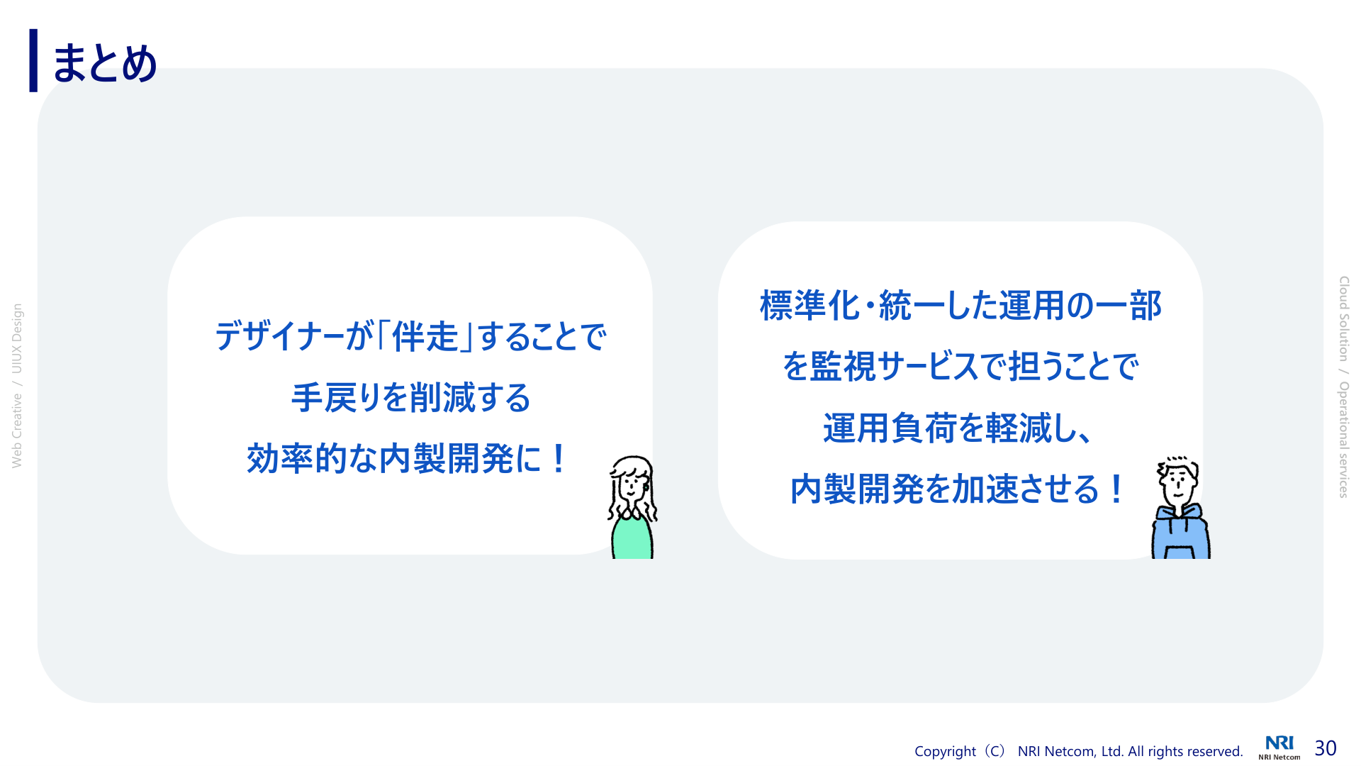 本日お伝えしたかったポイントは、前半のデザインパートではデザイナーがプロジェクトに伴走することで手戻りを減らし、開発全体の効率を高めるということ。後半の運用パートでは、運用を標準化・統一化し、さらに一部を監視サービスで補完することで運用負荷を軽減し、開発や改善に集中する環境を作るということです。NRIネットコムはデザインからシステムまでワンストップで提供することができます。