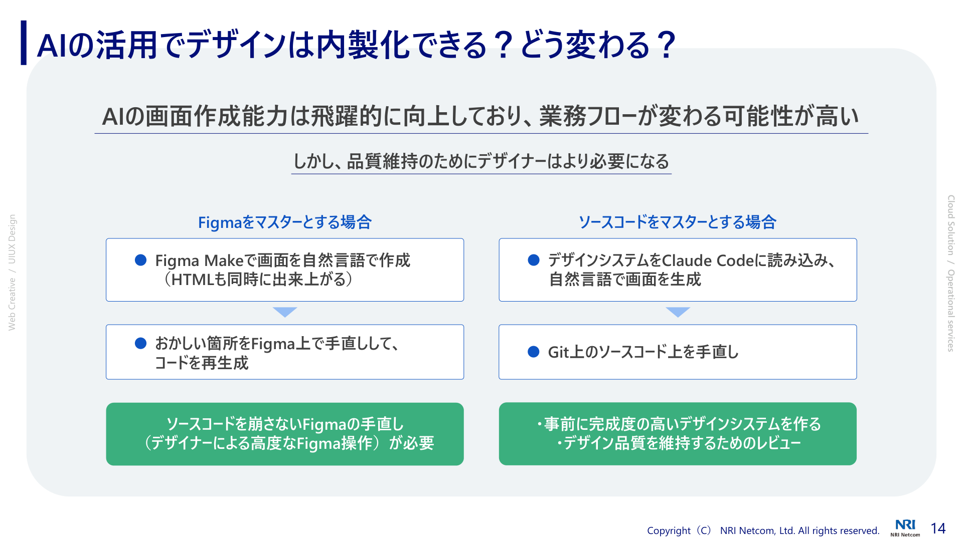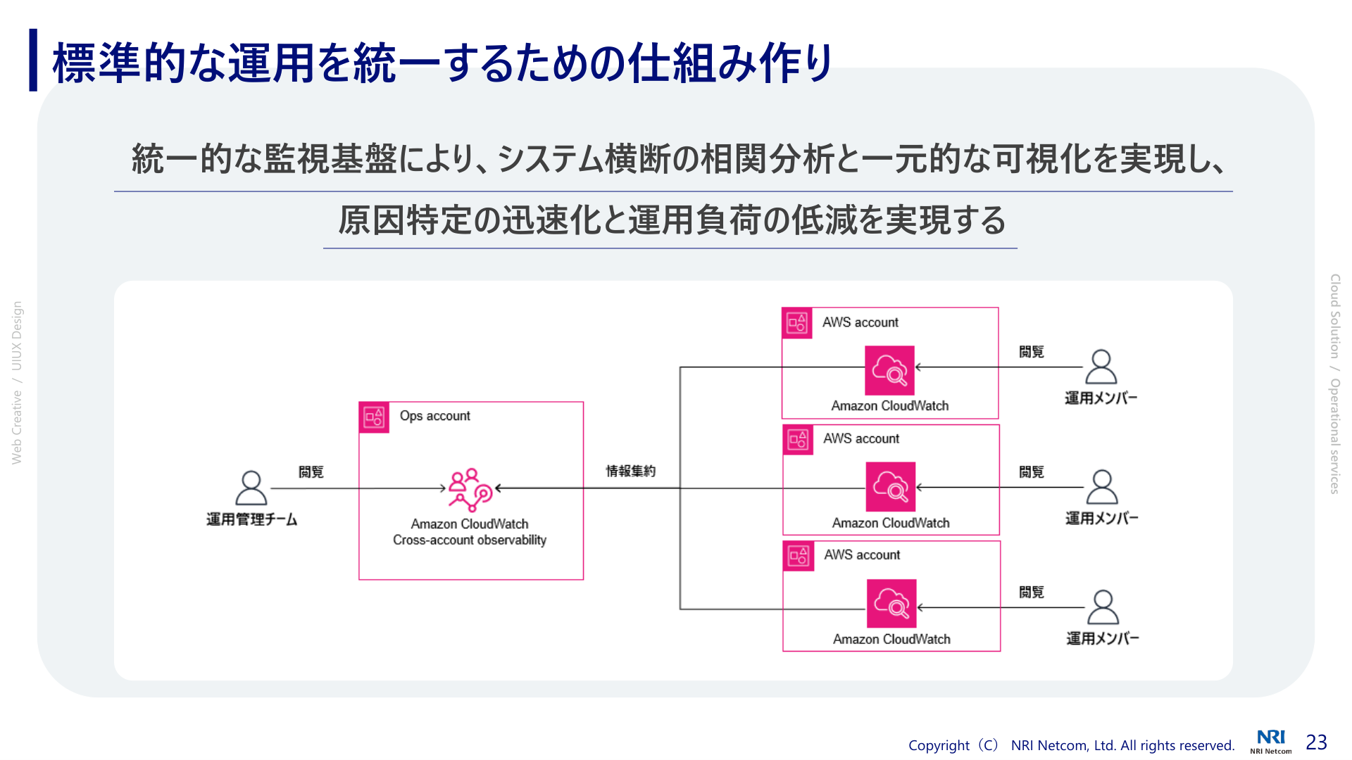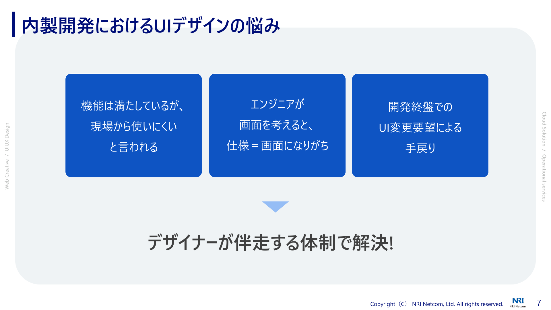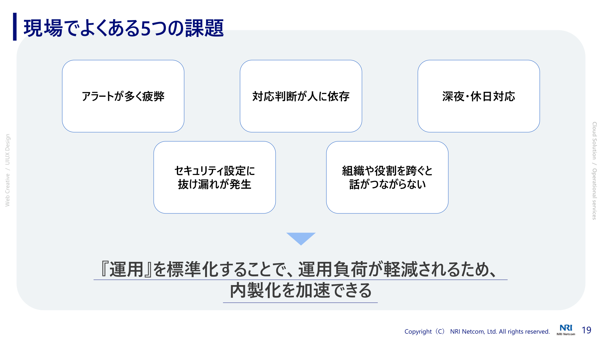 本日お伝えしたかったポイントは、前半のデザインパートではデザイナーがプロジェクトに伴走することで手戻りを減らし、開発全体の効率を高めるということ。後半の運用パートでは、運用を標準化・統一化し、さらに一部を監視サービスで補完することで運用負荷を軽減し、開発や改善に集中する環境を作るということです。NRIネットコムはデザインからシステムまでワンストップで提供することができます。