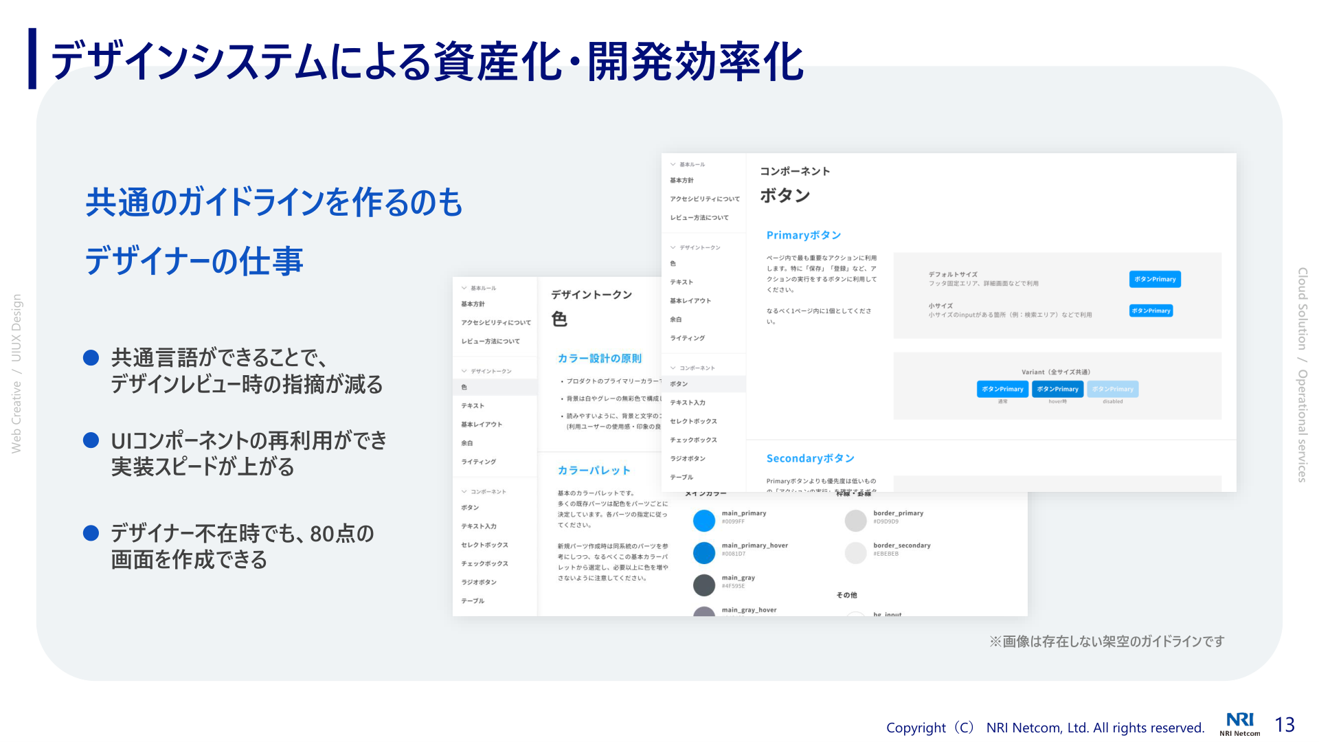 このガイドラインがあることで、エンジニアとデザイナーのコミュニケーションはガイドラインをベースに行われるようになり、「ボタンの色はどうしますか?」「余白は何ピクセルですか?」といった細かい確認がなくなります。UIコンポーネントの再利用により実装スピードが上がり、デザイナー不在時でも80点の画面を作成できるようになります。デザインシステムは将来のコスト削減に直結するチームの資産です。