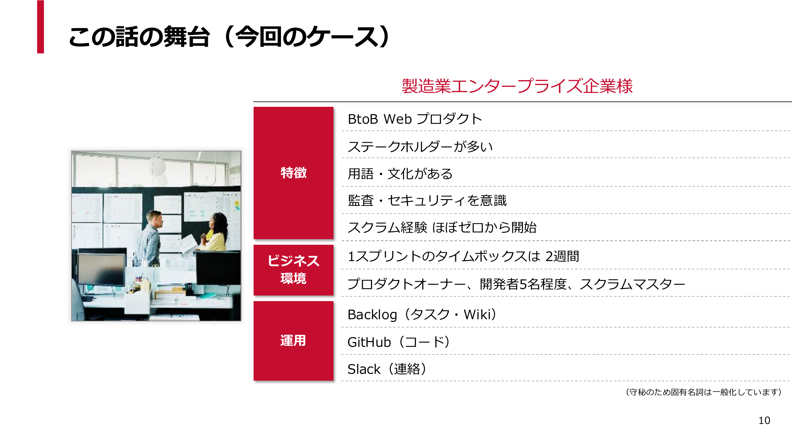 今回のケースでは、エンタープライズ企業のBtoB Webプロダクト開発がテーマとなります。お客様も含め、開発者はスクラム開発がほぼゼロの未経験状態でスタートしました。チーム体制はPO1名、開発者5名程度、スクラムマスターは内村が務めました。1スプリントのタイムボックスは2週間を採用しています。今回のプロジェクトでは、1カ月では間延びしやすく、1週間では運用負荷が高くなりやすいと判断し、2週間を採用しました。タスク管理にはBacklog、コード管理にはGitHubを使用しています。