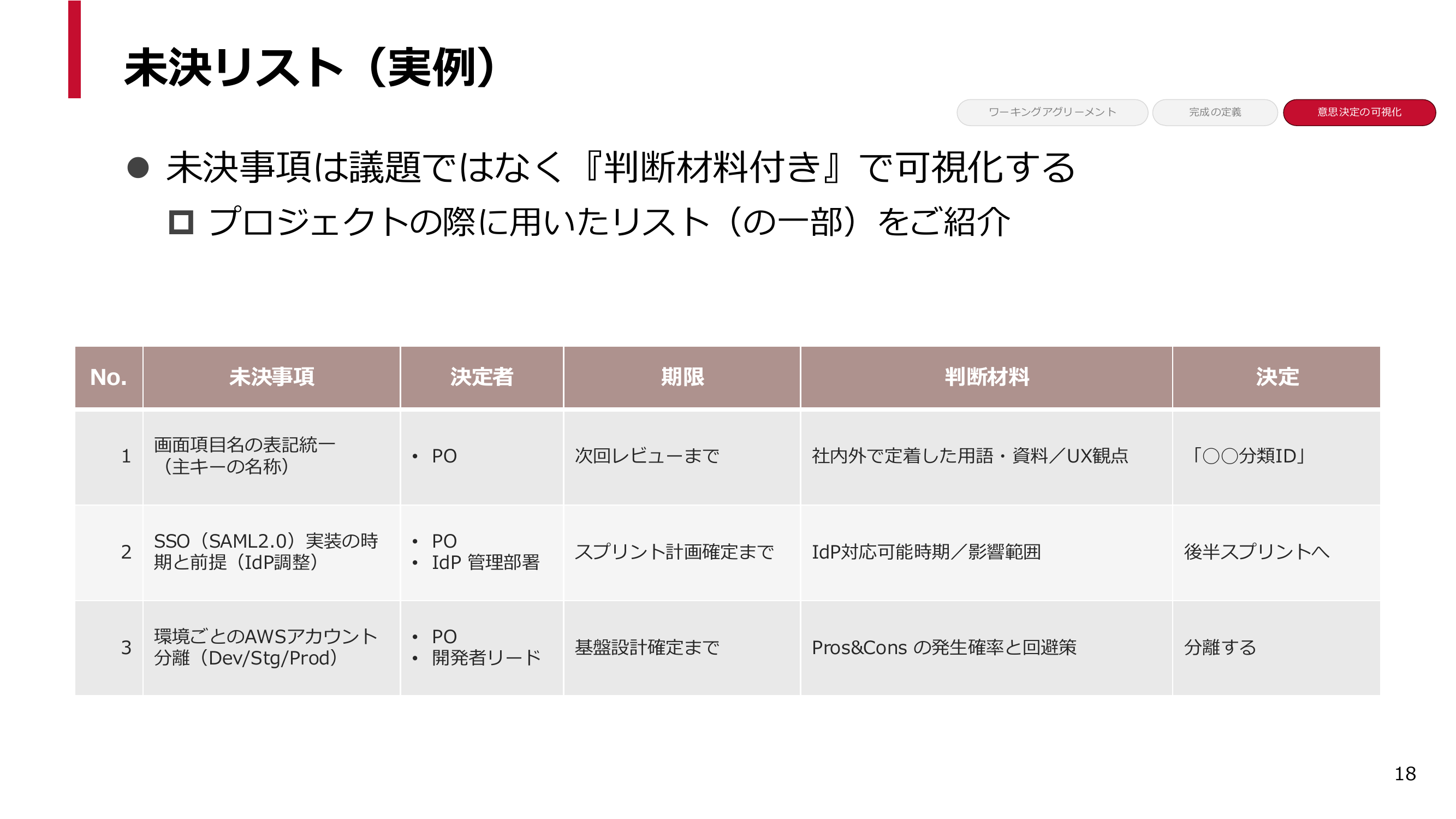 未決リストは議事メモではありません。決定待ちのものを判断材料付きで並べる表です。決定者、期限、判断材料が揃うと、未決が「決められる形」になります。未決リストにはもう一つ重要な効果があります。自社固有の用語やルール、判断基準を意思決定として仕様に刻み込むツールにもなり、これがそのまま事業の核になっていくのです。このプロジェクトでは3つの未決事項を例にご紹介します。