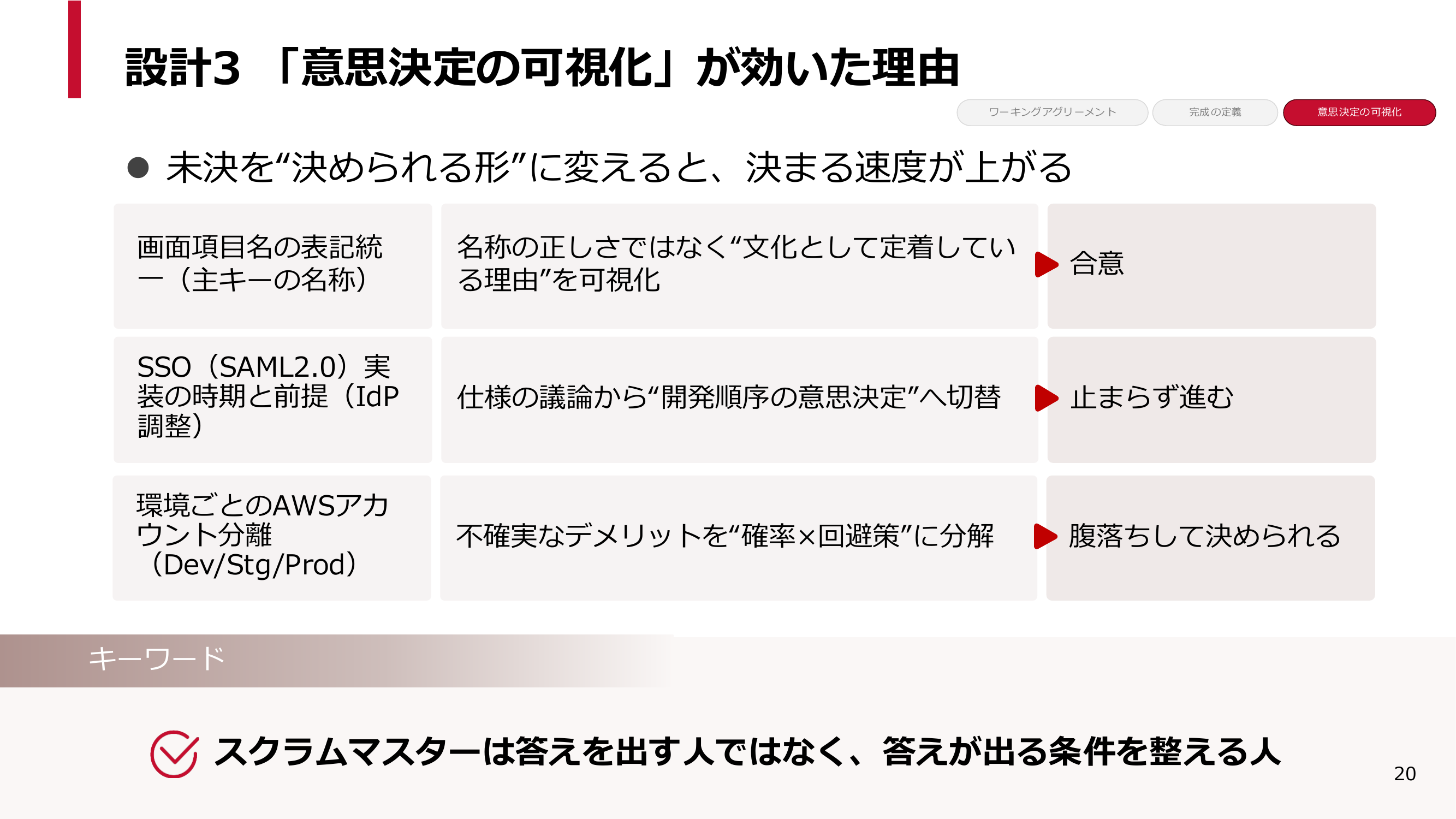 この3つの事例に共通しているのは、私は答えを出したのではなく、未決を「決められる形」に変えたということです。パターンは大きく3つあります。1つ目は用語の対立です。名称の正しさを議論すると必ず揉めるので、代わりに「なぜその言葉が文化として定着しているのか」を判断材料として可視化することで合意できます。つまり、言葉を決めるのではなく「決められる理由」を揃えるのです。2つ目は仕様で止まりそうなときです。意思決定の対象を仕様から「開発順序」に切り替えることで、止まらずに進みます。3つ目は不確実性です。「可能性がある」という言葉を放置すると永遠に決まらないので、「発生確率」と「回避策」に分解して腹落ちする形に変えます。これらをまとめると、やはり今日のキーワードにたどり着きます。スクラムマスターは答えを出す人ではなく、答えが出る条件を整える人です。