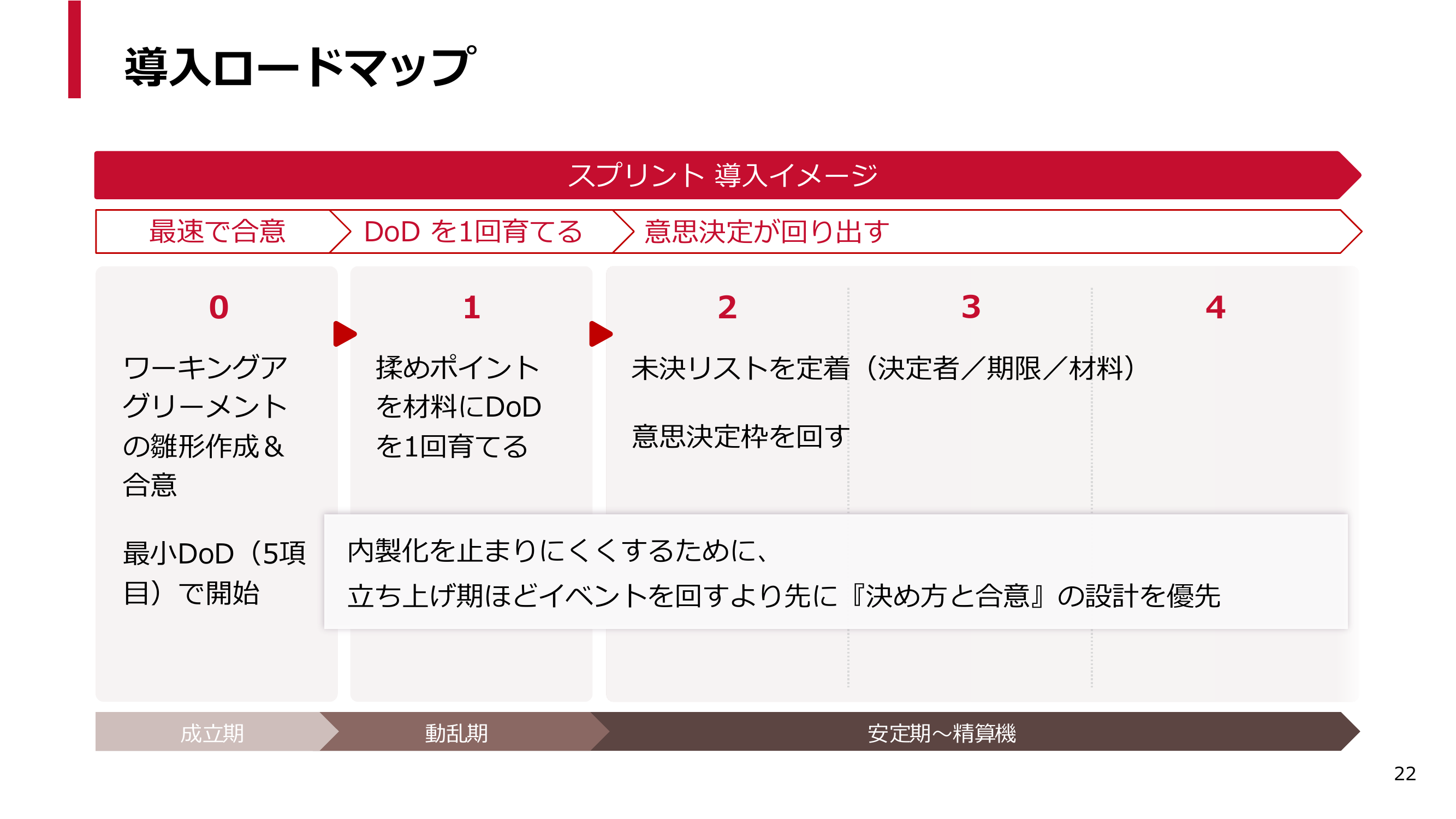 スプリント2以降では、未決リストを定着させていきます。コツは「誰が・いつまでに・判断材料は何か」を1行で書くことです。ここまで来ると、スクラムイベントを回すたびにチームの意思決定が回り始めます。スクラムにおける「タイムボックス」は時間枠ですが、私はこれを「意思決定枠」と呼んでいます。話すだけの会議ではなく、「決まる会議」になっていくのです。ここまでをスプリント2でやっていけば、あとは気合ではなく形で前に進めることができます。