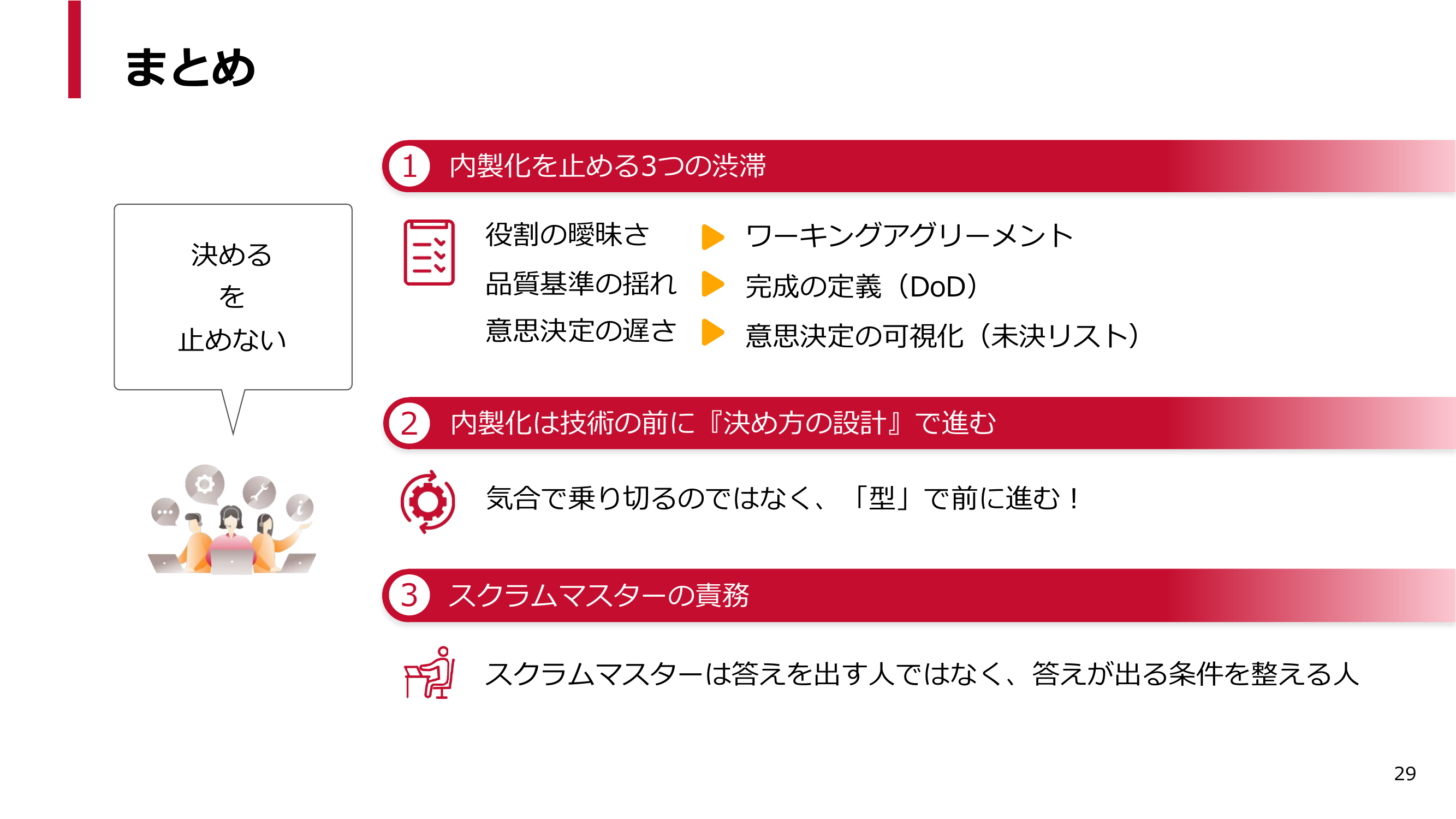 内製開発の本質を一言で言うなれば、「自社固有の用語、ルール、判断基準を合意と品質で積み上げていく力」です。気合ではなく、形で前に進めていく。この中にもスクラムマスターとしてプロジェクトに従事されている方がいらっしゃるかと思います。数々の困難に立ち向かっている皆さんを尊敬しています。スクラムマスターは答えを出す人ではなく、答えが出る条件を整える人です。ぜひチームの皆さんが答えにたどり着けるようにご尽力ください。