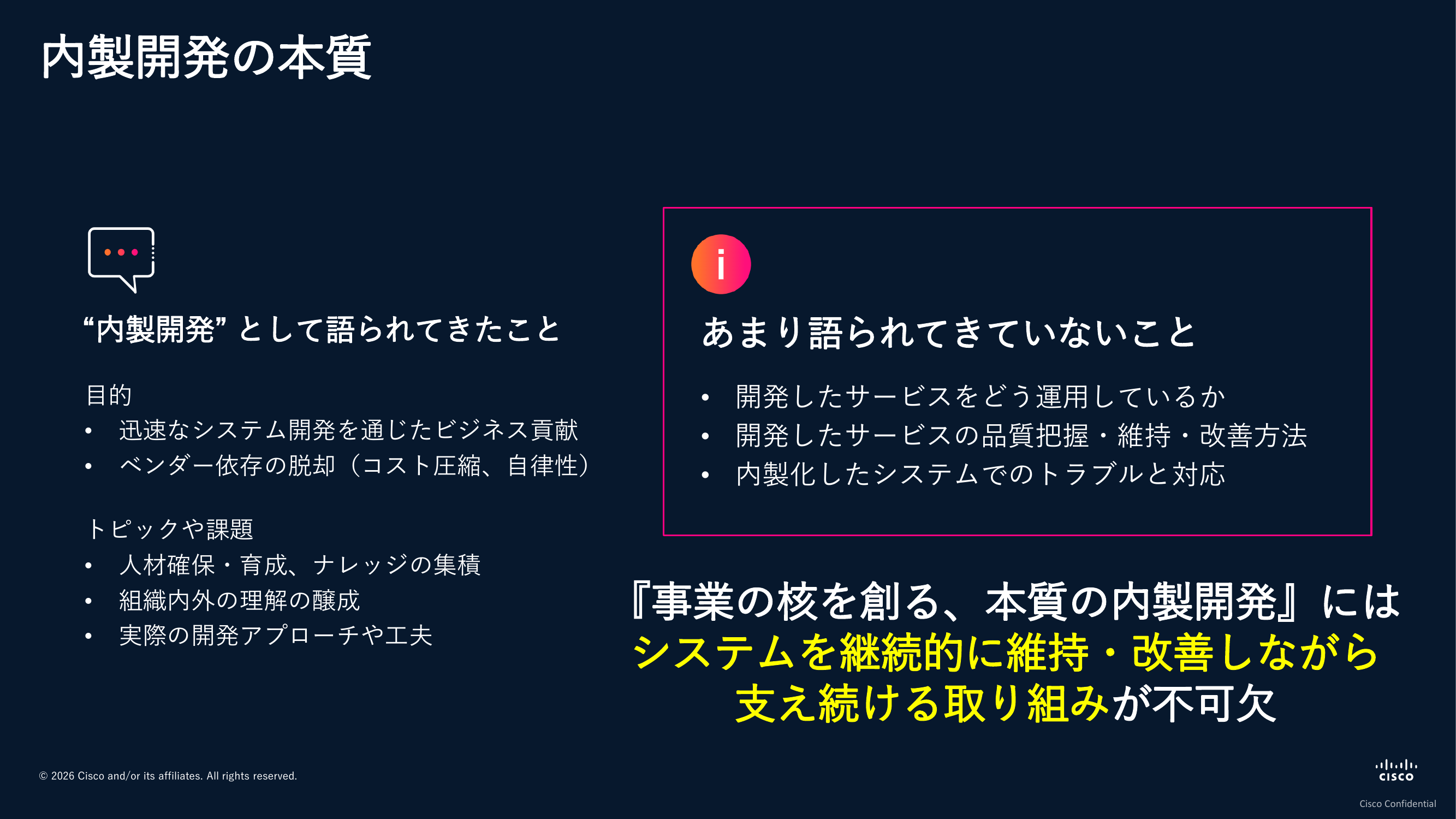 このサミットではいろいろなセッションで、ビジネスに貢献するためにどう迅速に内製開発に取り組むべきか、ベンダー依存をどう低減するか、人材育成や組織コミュニケーションをどうするかといった実践が語られていると思います。他方で、皆様が作る内製開発のサービスは、一度作ったら終わりではないはずです。むしろ作った後、サービスを運用していく時間の方が長くなっていきます。品質を維持し、場合によっては改善していく中で、どんなアプローチを取るべきなのか。トラブルが起きたときにどう対応してきたのか。こうした「作った後」の話は、これまであまり語られてこなかったように感じています。