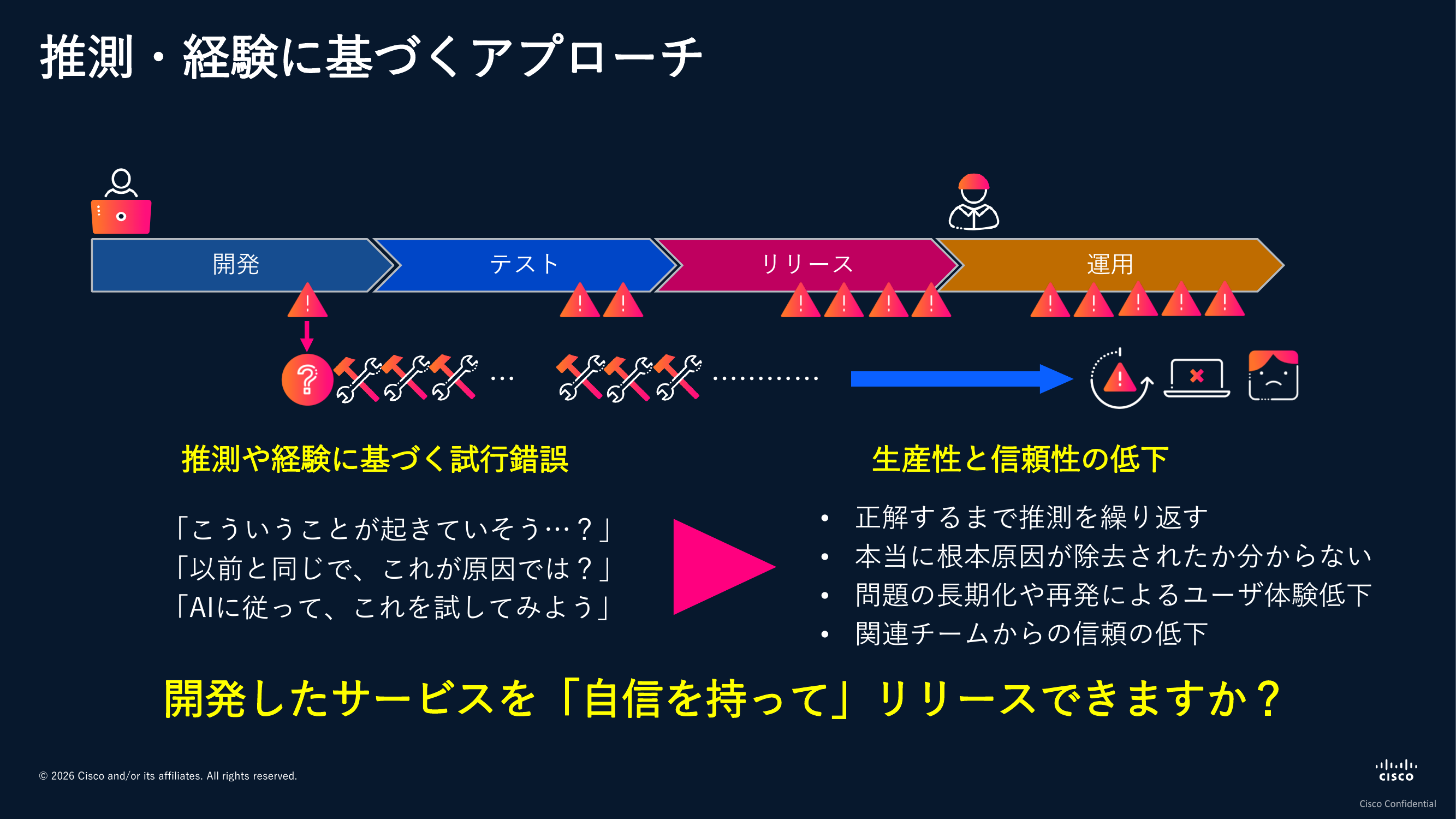なぜこんなことが起きたかを考えてみると、結局のところ、発生した想定外の事象に対して推測と経験に基づいてただ試行錯誤を繰り返していただけだったからです。自分の経験や詳しい方の知見に基づいて対応する、過去のナレッジを参照してみる。もちろんこれで直るパターンもありますが、そのナレッジも外れることは往々にしてあります。正解するまで推測を繰り返すしかなくなり、根本原因が除去されたかどうかもわからないまま、別のタイミングで同じ問題が再発してしまう可能性も残ります。