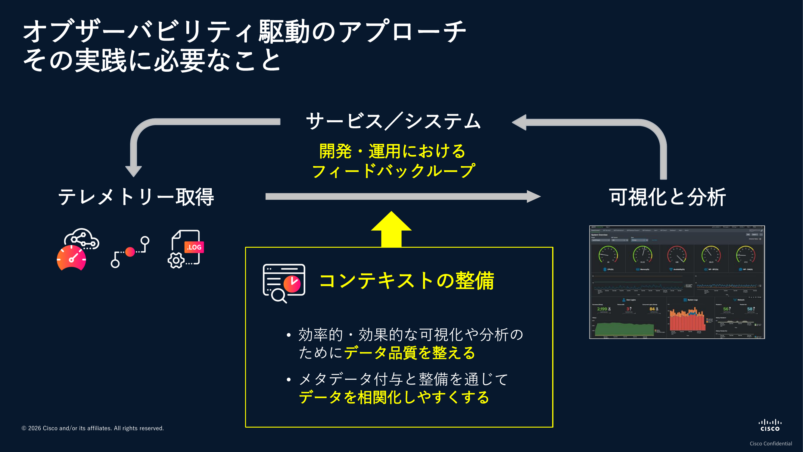 一つ一つのデータはあっても、それを関係づけて調査する手法がない。データに基づく状態の理解やアクションの選択を行っていく上では、コンテキスト、つまりデータを相関して分析できるようなメタデータを付与・整備することが重要になります。この部分に取り組みきれていないお客様はまだまだ多くいらっしゃいますし、これから内製開発に進まれる皆様におかれましては、プラクティスを変えるタイミングにぜひ意識を払っていただきたいと思います。