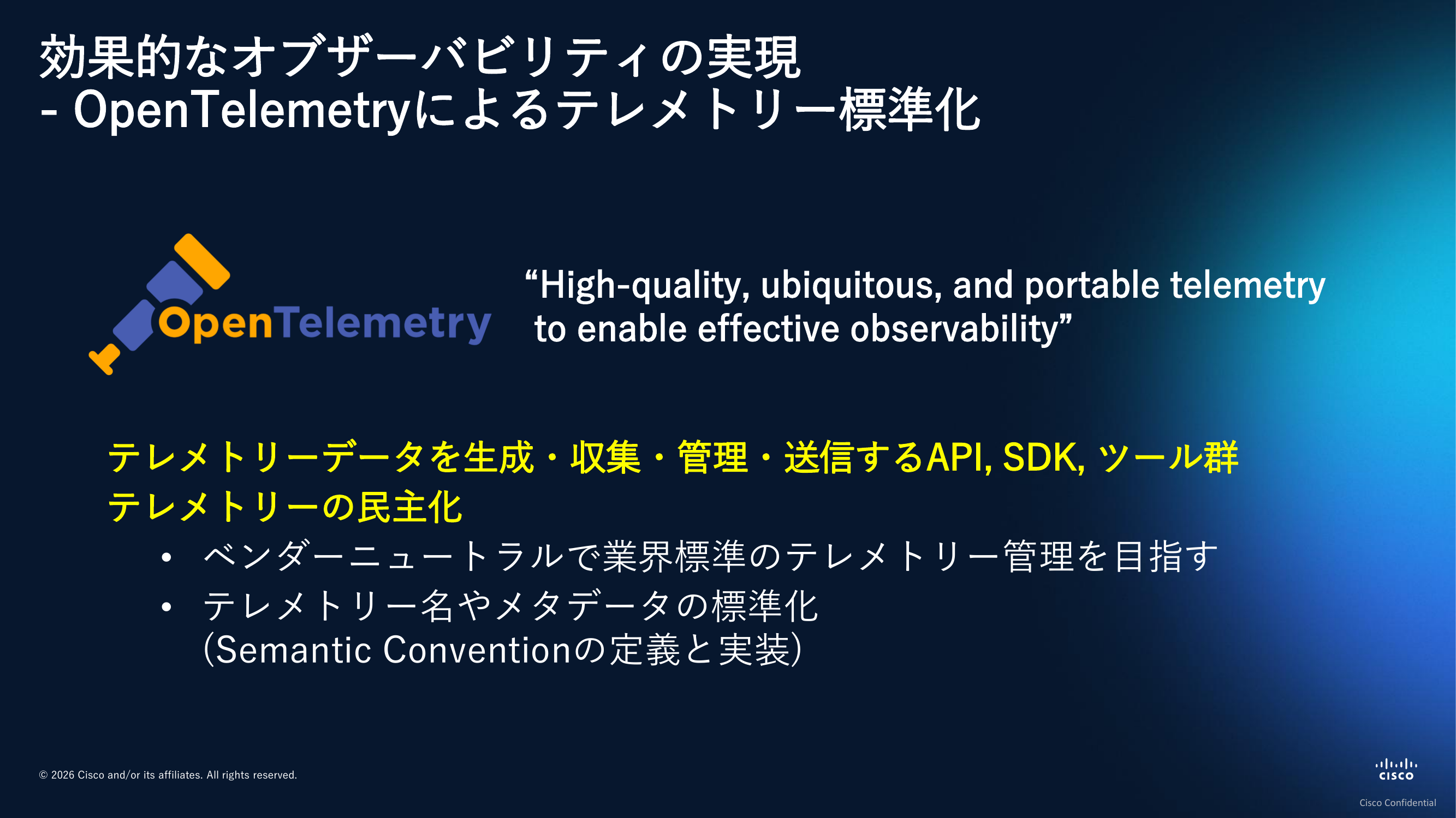 こうした課題を克服することに取り組んでいるプロジェクトとして、OpenTelemetryがあります。Cloud Native Computing Foundationが推進しているプロジェクトで、テレメトリーデータを生成・収集・管理・送信するためのAPI、SDK、ツール群を提供しています。テレメトリーデータ自体を標準化することに取り組んでおり、OpenTelemetryのツール群に基づいてデータを扱えば、自然とメタデータが整い、分析しやすい状態になっていきます。