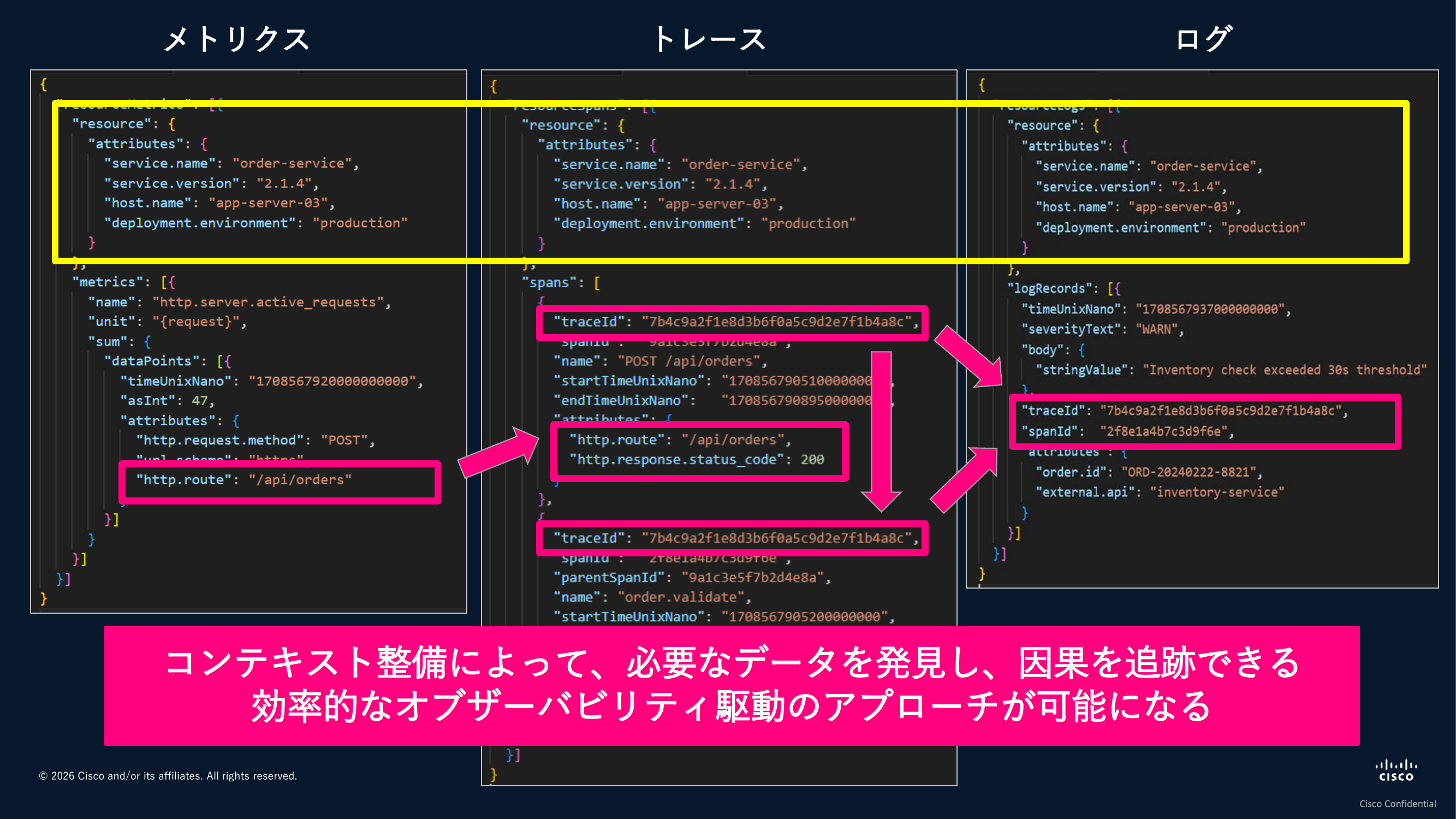 一番上の部分を見ると、どのテレメトリーにも共通した内容が入っています。「プロダクション環境のapp-server-03で動いているorder-serviceというアプリケーションのバージョン2.1.4のデータ」というように共通化されているのです。メトリクスで/api/ordersの処理が滞留しているとわかれば、同じエンドポイントのトランザクション情報がトレースの中に埋め込まれています。同じキーとバリューが入っているので紐づけやすくなり、さらに同じIDで後続処理も追えます。そのIDをキーにしてログを拾ってくると、検証処理に30秒以上かかっていることが記録されている。