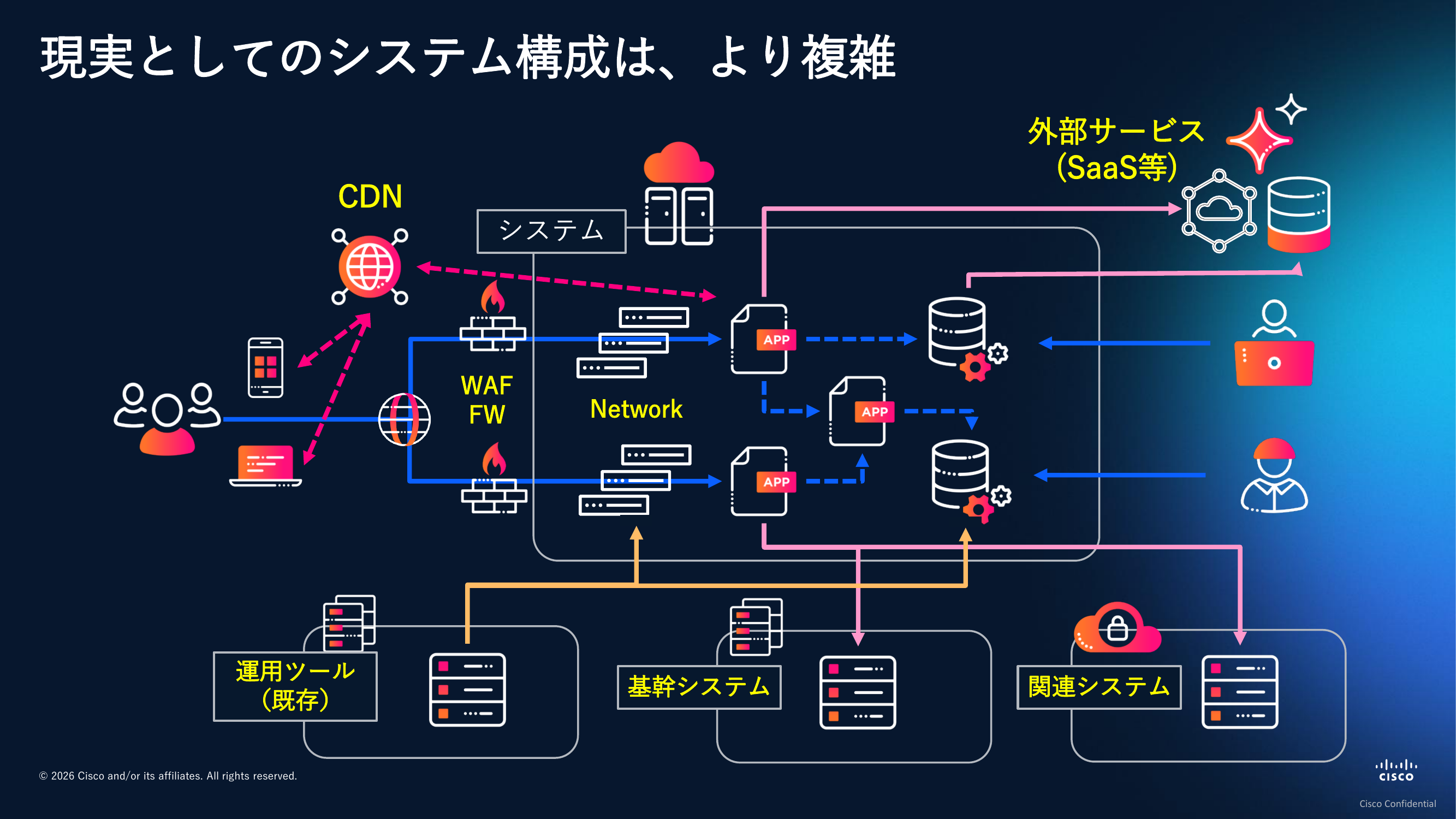 OpenTelemetryに準拠するサービスは広がりを見せていますが、必ずしもあらゆるすべてのシステムコンポーネントやサービスが対応しているわけではありません。皆様が運用管理されているシステムは、より複雑で、さまざまなコンポーネントから成り立っているはずです。CDNやWAF、ロードバランサー、物理的なネットワーク機器、本番サービスイン済みの関連システム、基幹システム、既存の運用ツール、外部のSaaSサービス。こうしたものが全部連携した形でシステムは動いており、全体が見えなければ健全性は判断できません。