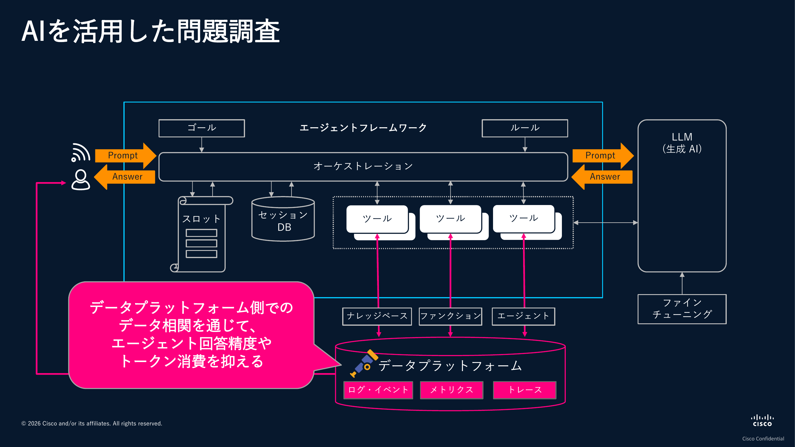同じプラットフォームにデータを置いたとしても、データが構造化されていなければ、必要以上のデータを参照してつなぎ合わせてしまい、構造化されている場合と比較して推論精度は下がります。つまり、データプラットフォーム上でデータを相関できる状態にしておくことで、エージェントの回答精度を高め、トークン消費も抑え、効率的にAI分析できるようになるということです。