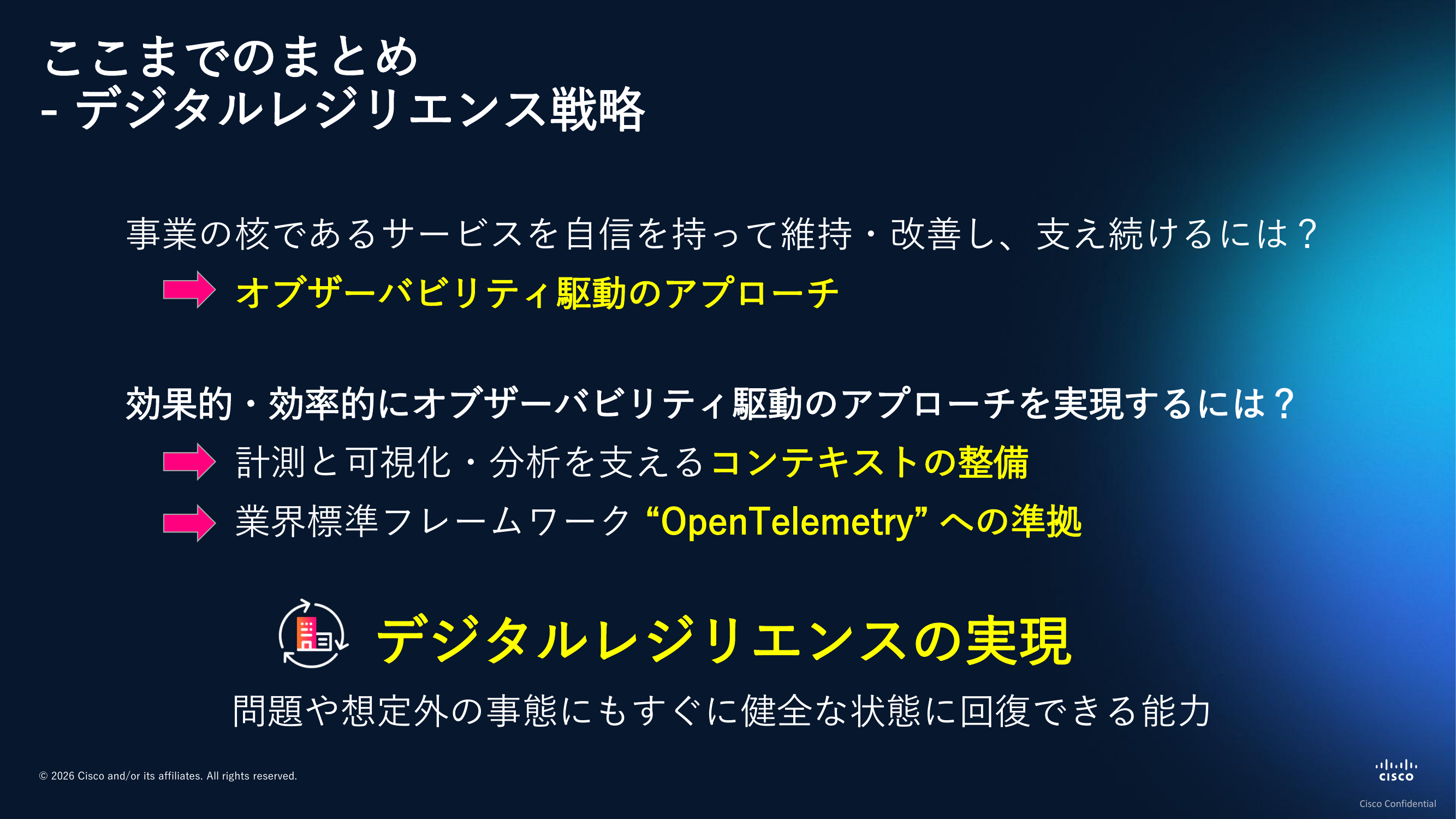 ここまでのまとめとして振り返ると、皆様が内製開発を通じて事業の核として作り上げていくサービスを、自信を持って維持・改善し、支え続けていくには、オブザーバビリティ駆動のアプローチが重要です。そして、このアプローチを効果的・効率的に実践するためには、計測と可視化・分析を支えるコンテキストの整備や、業界標準フレームワークであるOpenTelemetryへの準拠が鍵となります。こうした取り組みを通じてデジタルレジリエンスを実現していくこと、すなわち問題や想定外の事態にもすぐに健全な状態に回復できる能力を備えることが、皆様の運用業務や開発業務をスムーズにしていくことにつながります。