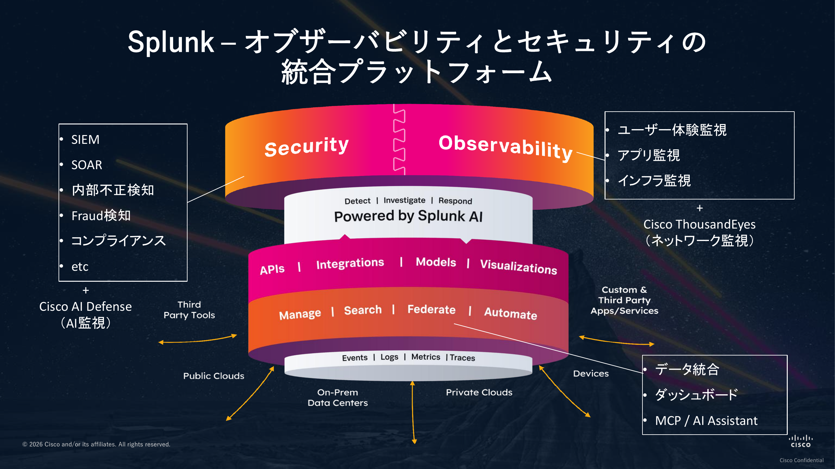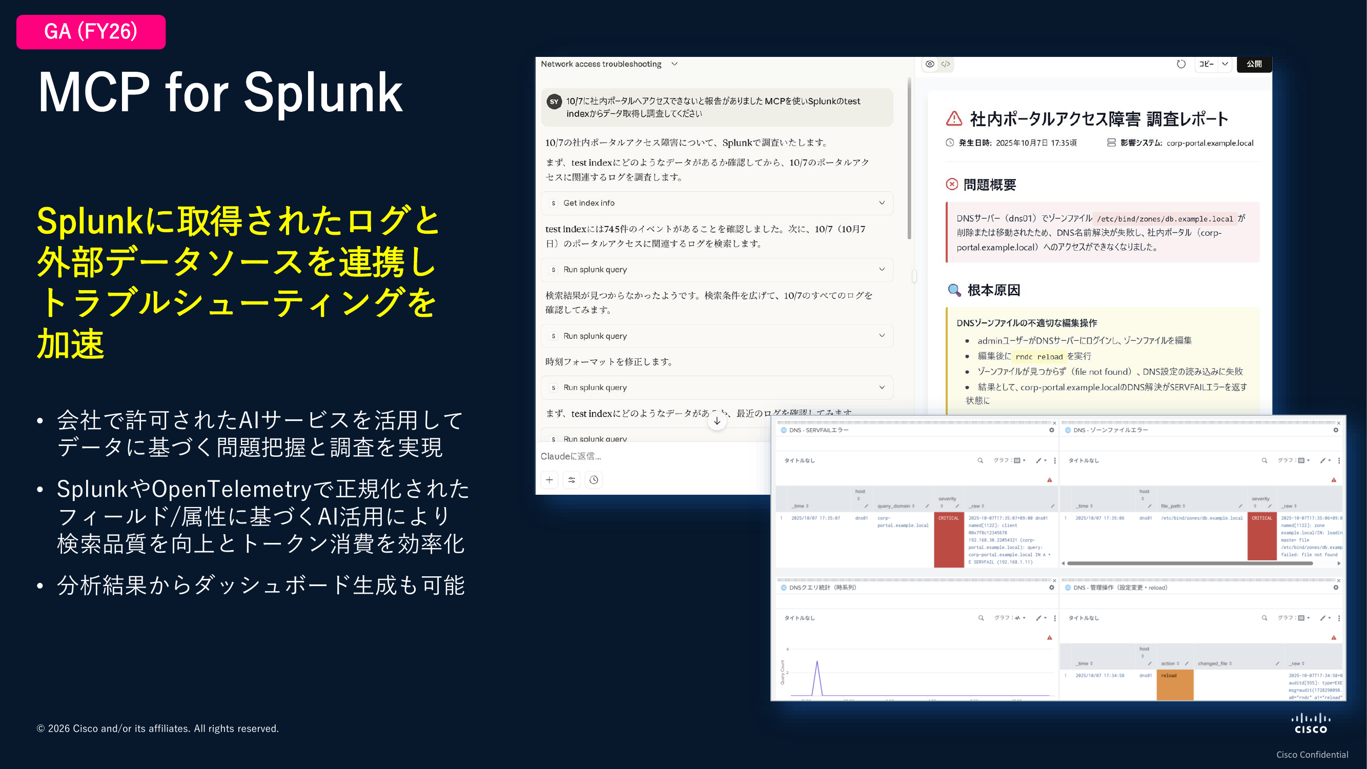 Splunkに蓄えたデータ以外のものも参照しながらAIに分析させるためのMCPの機能も提供を始めています。いろいろなコラボレーションツールや外部データソースを含めて、汎用的なAIサービスの頭脳と組み合わせて活用いただけます。ここで強調したいのは、AIがすごいという話をしたいのではなく、OpenTelemetryやSplunkといった基盤を通じてデータが整っている状態、コンテキストが整備されている状態であるからこそ、AIが分析しやすい状態になっているのだという点です。