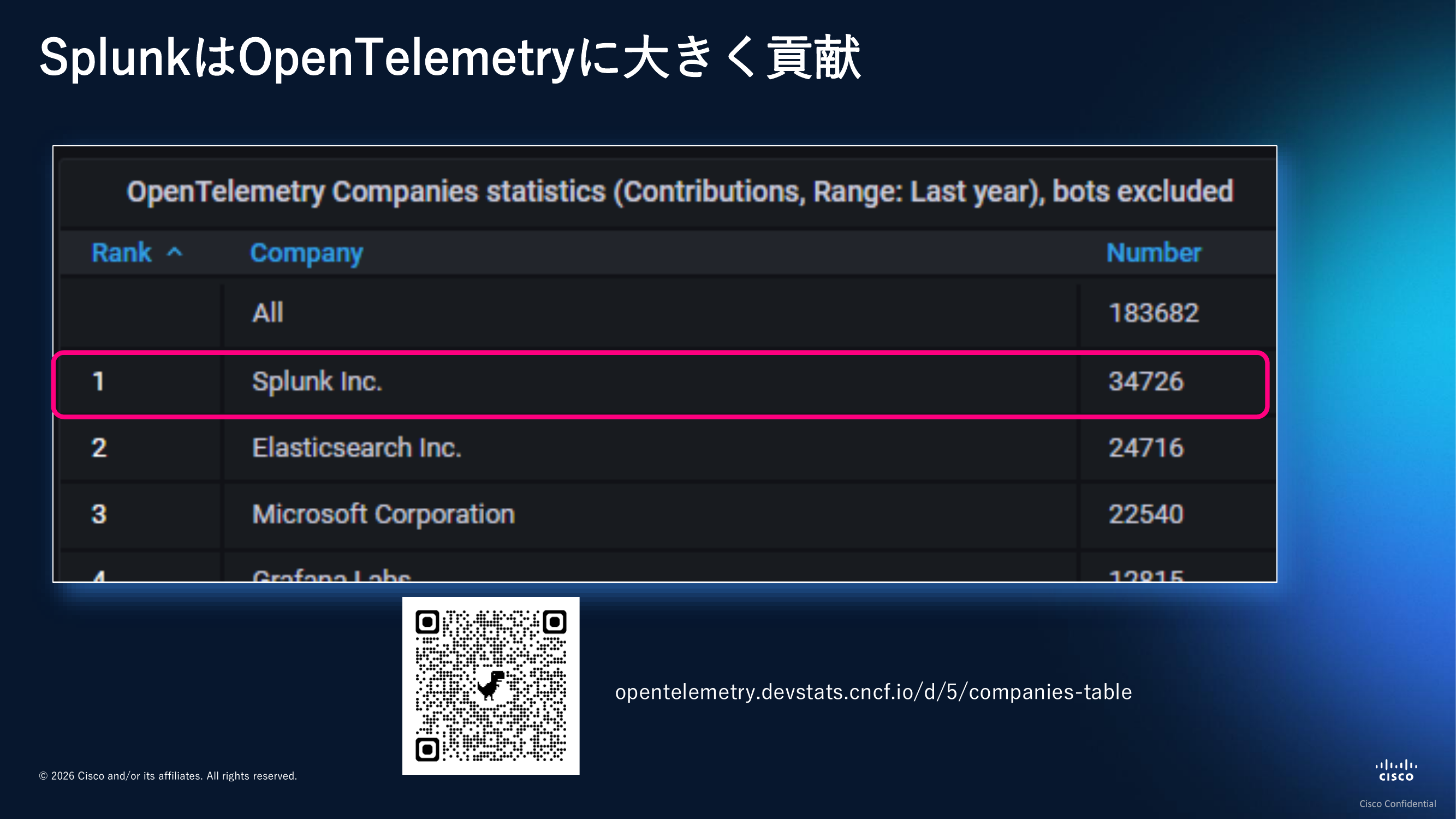 本セッションでOpenTelemetryに言及しましたが、SplunkはOpenTelemetryネイティブなオブザーバビリティプラットフォームを提供しています。長年にわたりOpenTelemetryプロジェクトに大きく貢献していることからも、この点をご理解いただけるかと思います。