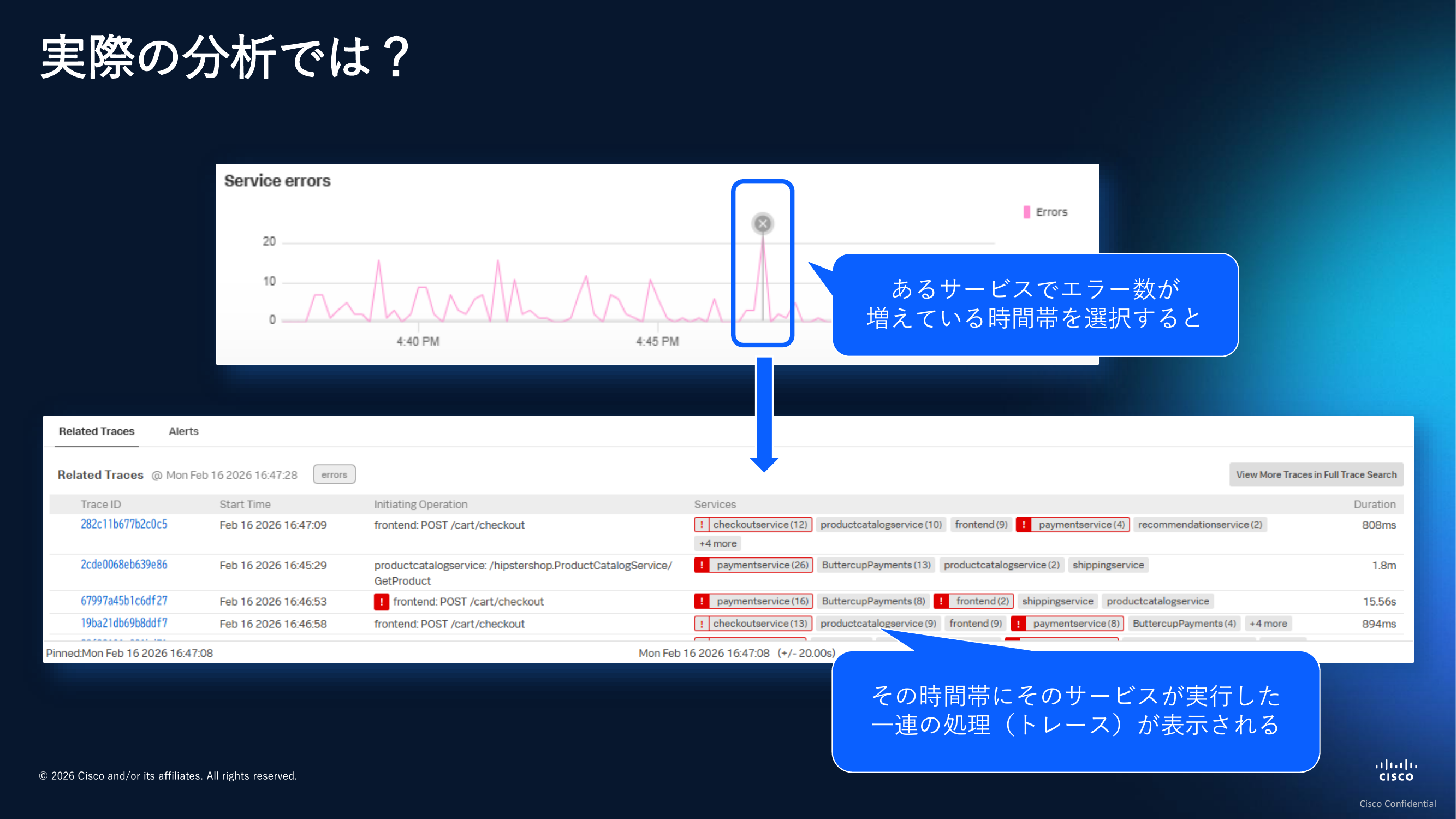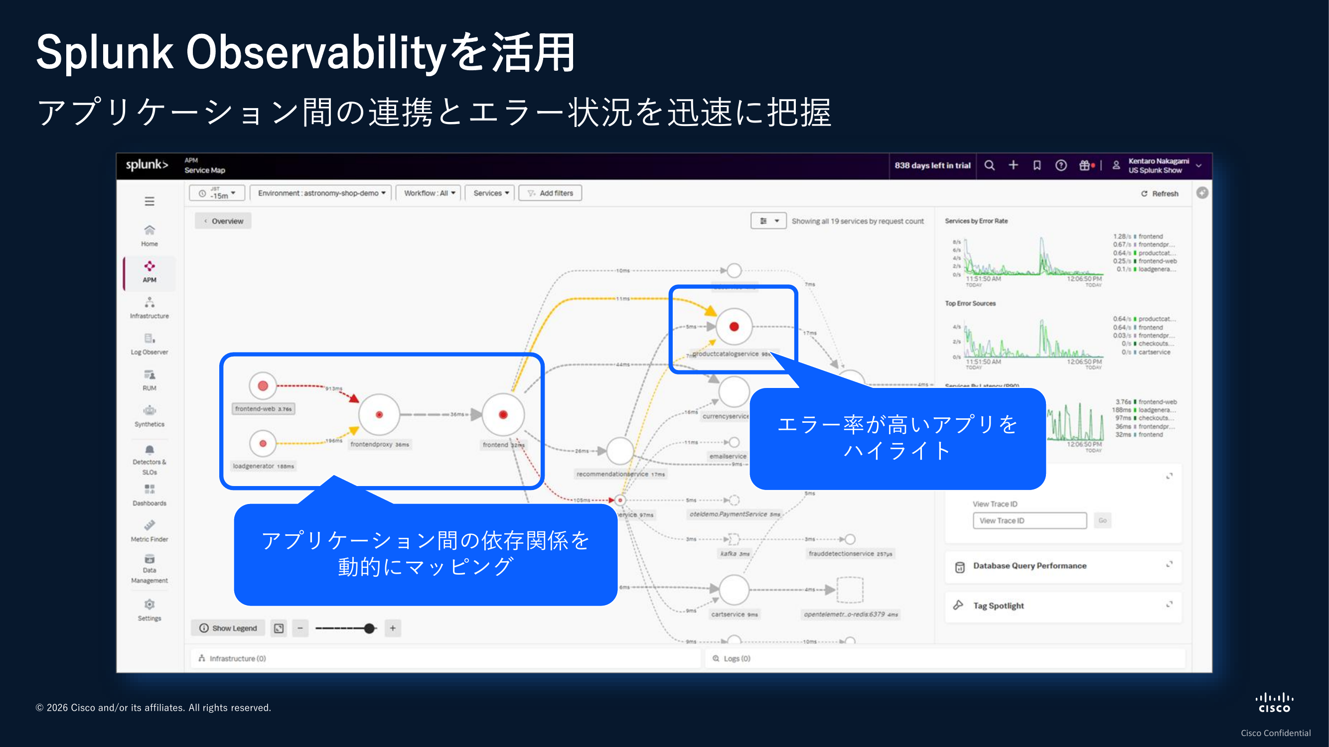 とはいえ、こうしたデータをそのまま人が目で追いかけるのは大変です。Splunkのような専用のオブザーバビリティプラットフォームを活用することで、データの相関分析がしやすくなり、システムを健全な状態に保ちやすくなります。