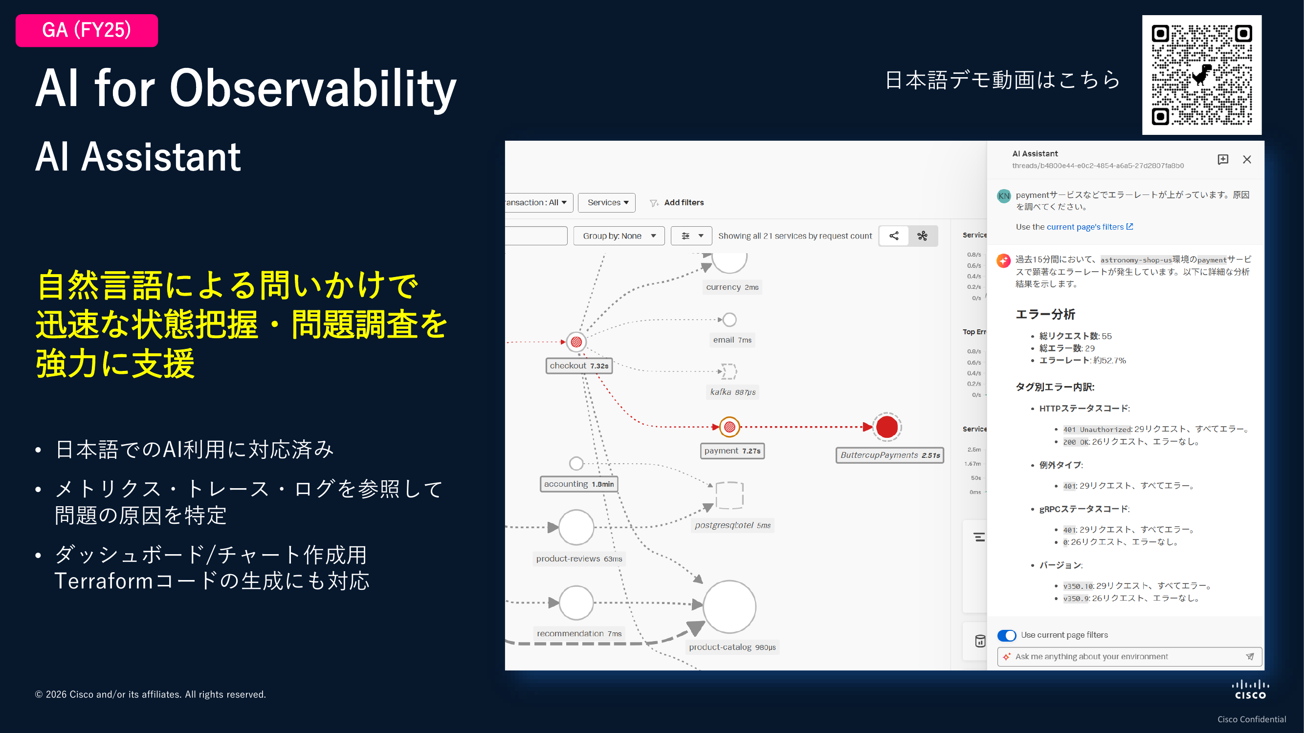 セッションでは、内製開発で作り上げたサービスを「作った後」にどう支え続けるかという観点から、推測や経験に頼らないオブザーバビリティ駆動のアプローチの重要性が語られました。OpenTelemetryによるテレメトリーデータの標準化やコンテキストの整備、Splunkを活用したデータ相関分析、さらにはAI AssistantやAI Troubleshooting Agent、MCP for Splunkといった機能による問題調査の効率化まで、デジタルレジリエンスを実現するための戦略が紹介されました。