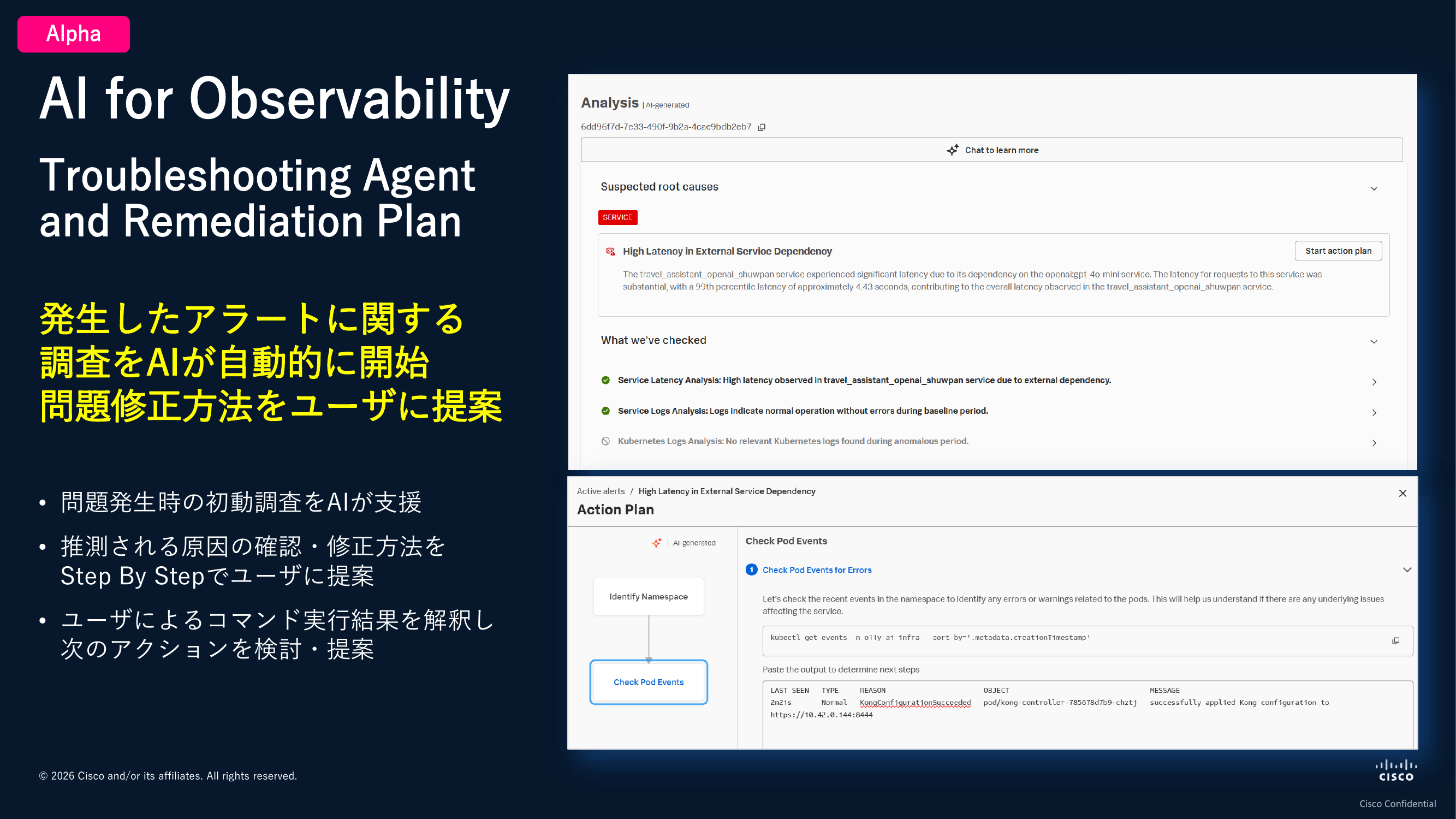 加えて、現在開発中でまもなくリリース予定のAI Troubleshooting Agentという機能では、通知されたアラートに含まれるリンクをクリックすると、Splunk ObservabilityのWebページが立ち上がり、その時点でAIが自動的に問題調査を開始して原因の推測結果を教えてくれるというものです。
