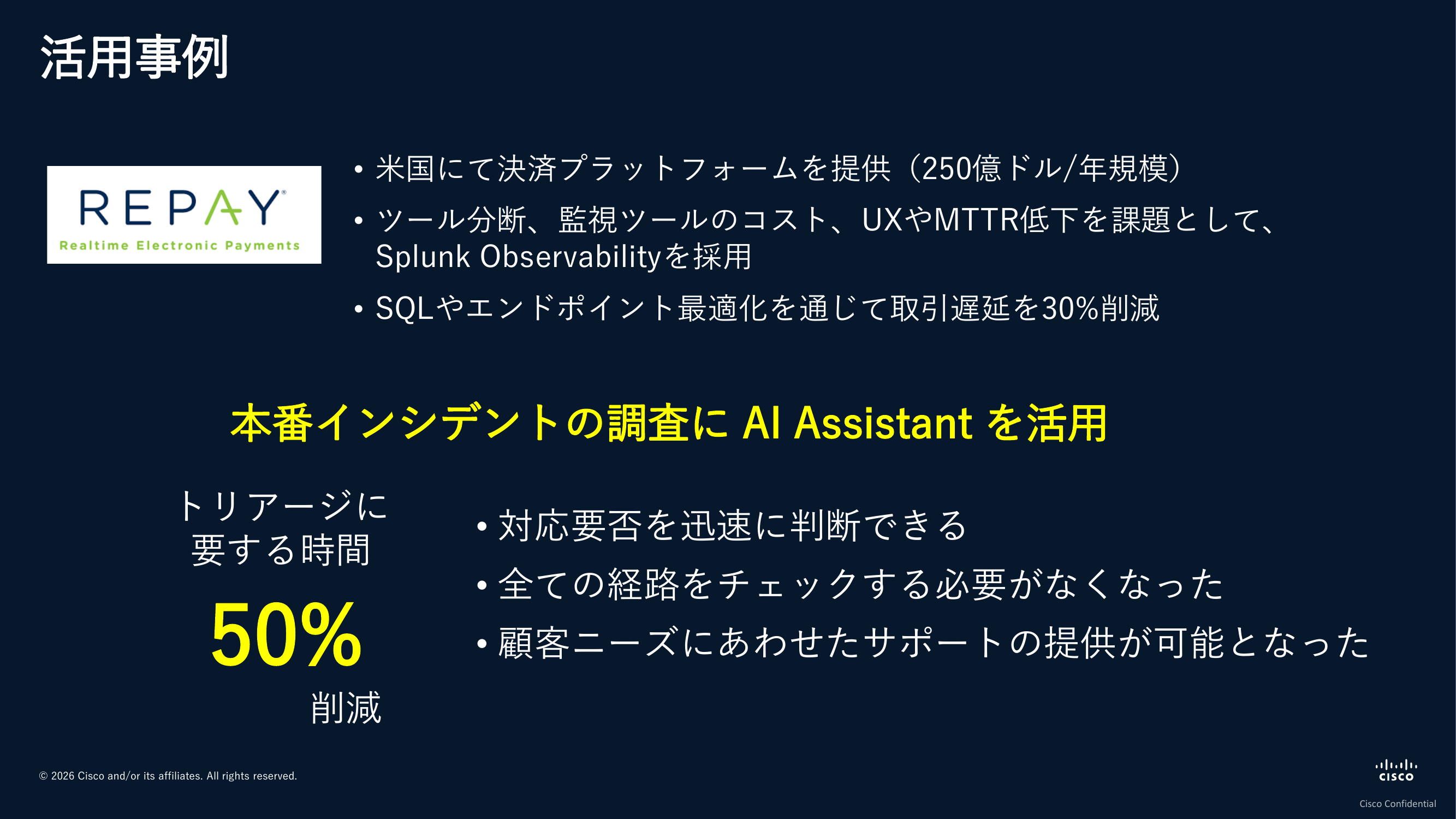 AI Assistantを実際にお使いいただいているお客様の事例をご紹介します。アメリカのRepayという企業は、年間250億ドル規模の決済をつかさどるプラットフォームを提供しています。本番アプリケーションで発生した問題に対してAI Assistantを活用し、対処すべき問題がどれかを判断するトリアージまでの時間を50%削減できたとのことです。AI Assistantが分析をしてくれるので、すべてのアプリケーションのエンドポイントを全部調査したり、すべてのアラートを全部チェックしたりする必要がなくなったというコメントをいただいています。